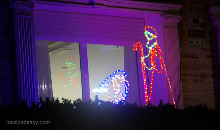 Las figuras de los Magos de Oriente y de la Sagrada Familia (Jesus, María y José) están elaboradas con tubos de coloridas luces navideñas.
