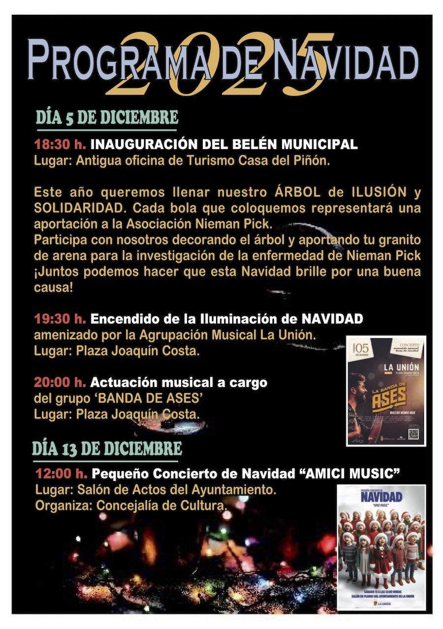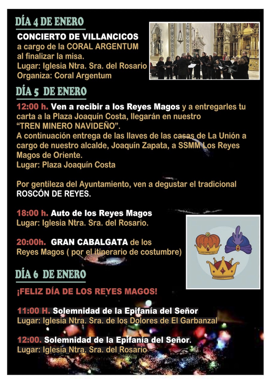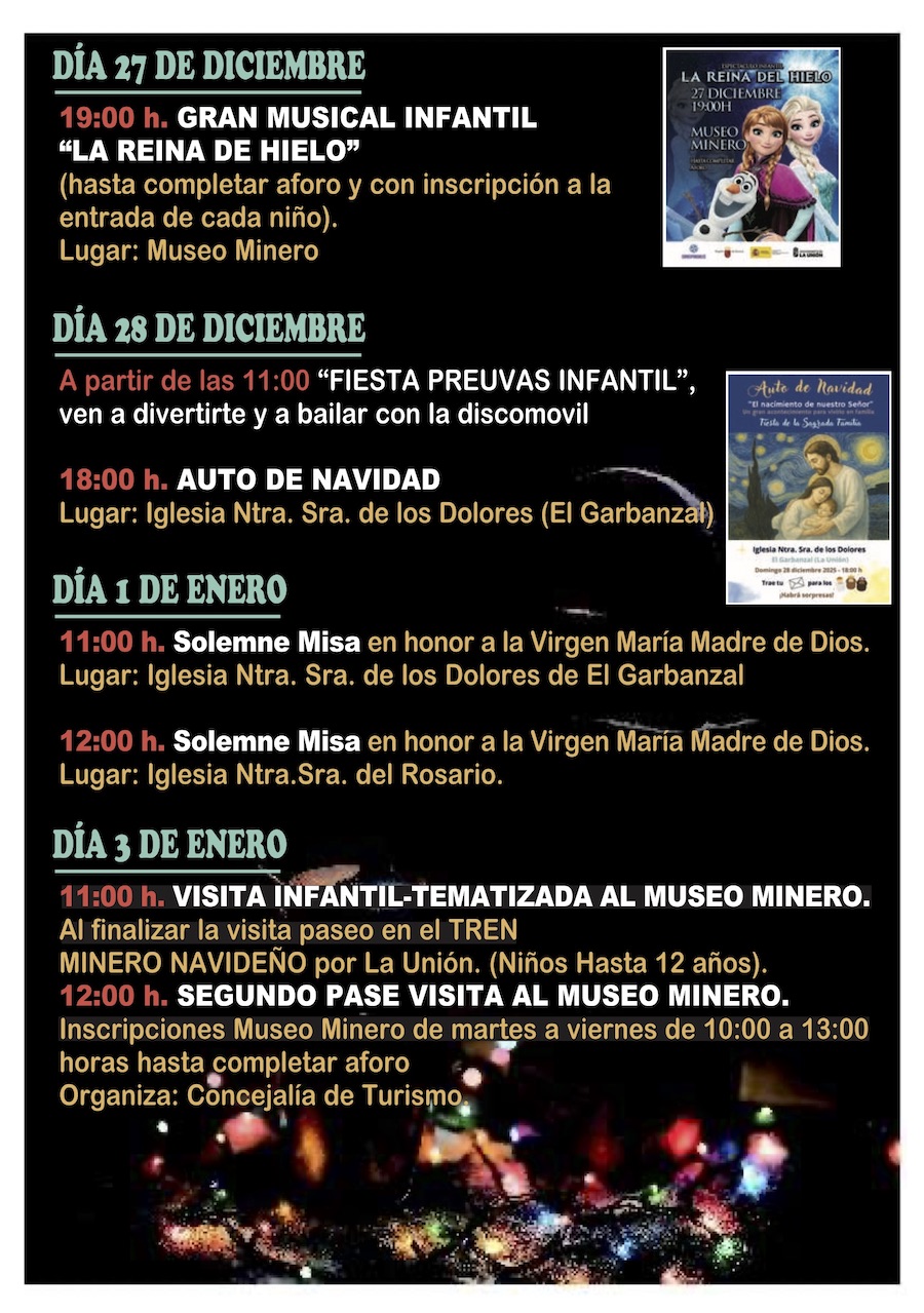 El Ayuntamiento de La Unión da a conocer el programa de actividades, que arranca este viernes con el encendido y la inauguración del Belén y que culminará el 6 de enero. Entre otras propuestas, hay música en directo ('Banda de ases', 'Amici Music', 'Concierto de Navidad', 'El camarote de los Hermanos Marx', 'Mujeres con alma' ), papanoelada motera, concurso de postres, exposiciones, carrera de cintas, doble monólogo, cine, musical infantil, preuvas, cabalgata de Reyes Magos, tren minero y actos religiosos.