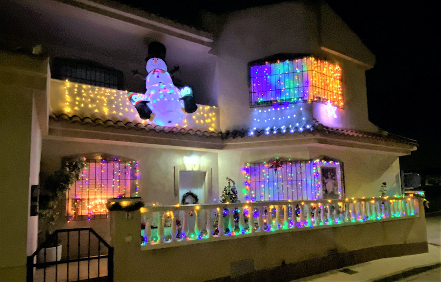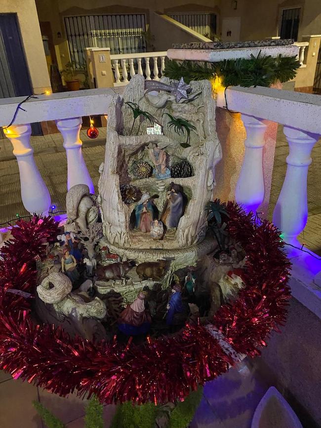 En este caso, además de la colorida iluminación, ofrece un muñeco de nieve y la imagen de un gran niño Jesús, a lo que se suma un Nacimiento en el suelo, con figuras de la sagrada familia, los Reyes Magos y pastores.