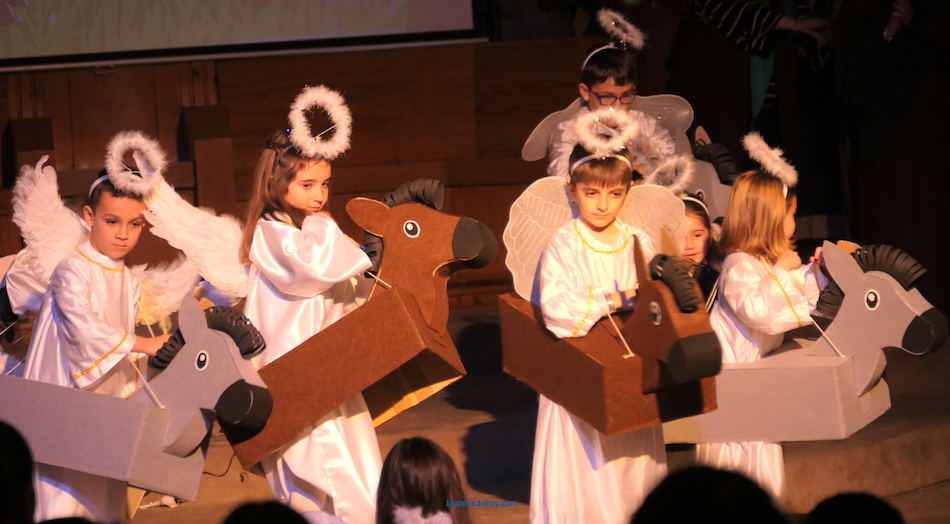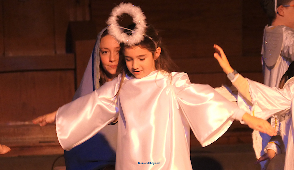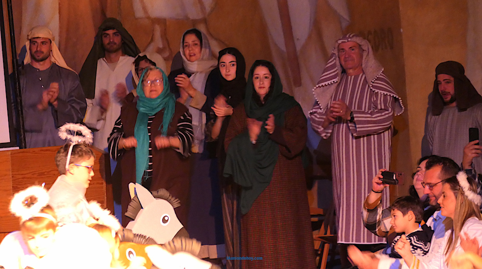 La puesta en escena, en una combinación de proyecciones con villancicos cantados en directo (con coreografías a cargo de los más pequeños), abarcó desde la anunciación a María de que iba a ser madre de Jesús hasta la llegada de los Reyes Magos, siendo el marco una iglesia copada de público, teniendo que recurrir algunos espectadores a la zona de entrada.