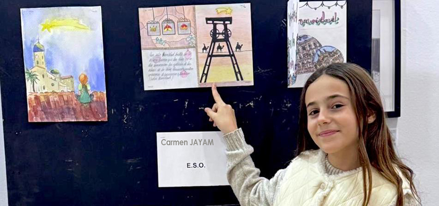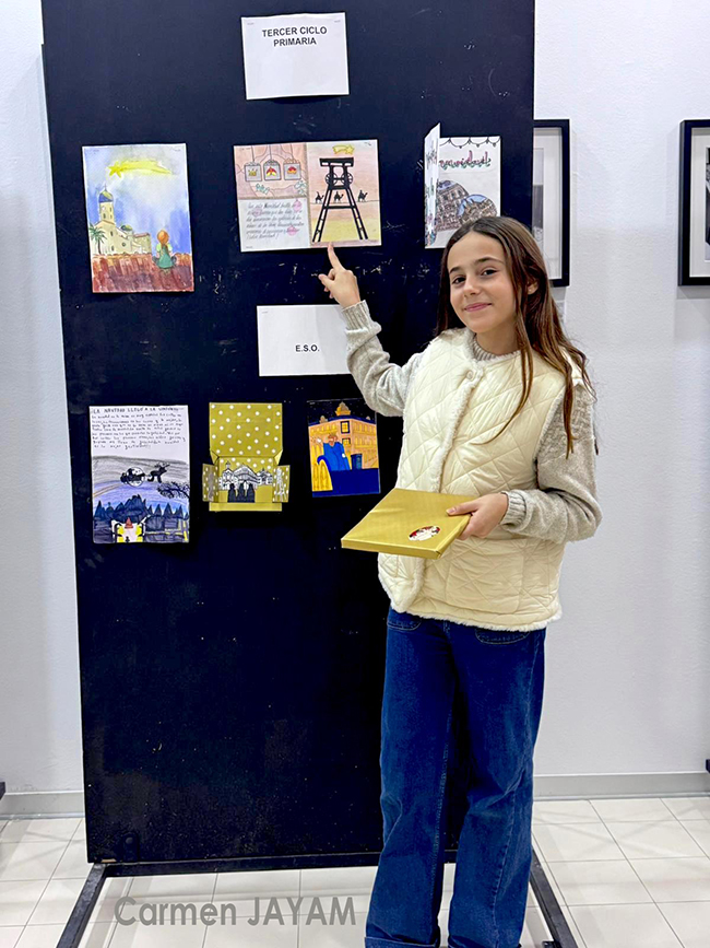 Beatriz Romero Larios posa señalando el dibujo presentado en el concurso de postales navideñas organizado por el Ayuntamiento de La Unión, en el que ha figurado entre los participantes premiados, en su caso dentro del tercer ciclo de Primaria, los cuales están recogiendo hoy los premios.