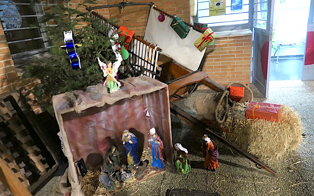 Nacimiento montado en la plaza del centro cívico de Roche, que incluye un carro, un trillo y un fardo de paja como símbolos de la faceta agrícola de esta tierra.
