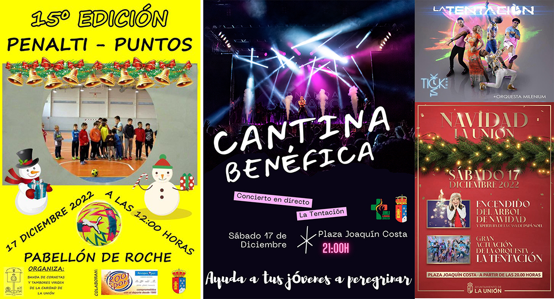 Numerosa actividad entre sábado y domingo de esta semana en La Unión, Roche y Portmán en torno a la Navidad. Hay, que conozcamos, catorce propuestas no deportivas. Destacar que en la ciudad actuará ‘La tentación’ y habrá cantina solidaria con los jóvenes unionenses que van a peregrinar a Lisboa, que en Roche hay concurso penalti-punto y que Portmán se enciende la iluminación navideña y habrá coros interpretando villancicos.