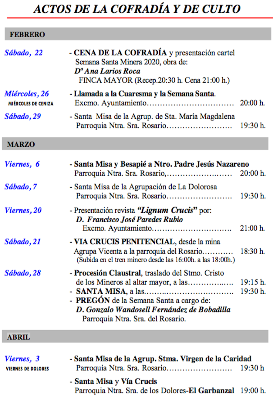 La Ilustre Cofradía del Cristo de los Mineros ha cerrado fechas y horarios de los actos de cuaresma y de las procesiones a celebrar durante el presente año entre los meses de febrero, marzo y abril.