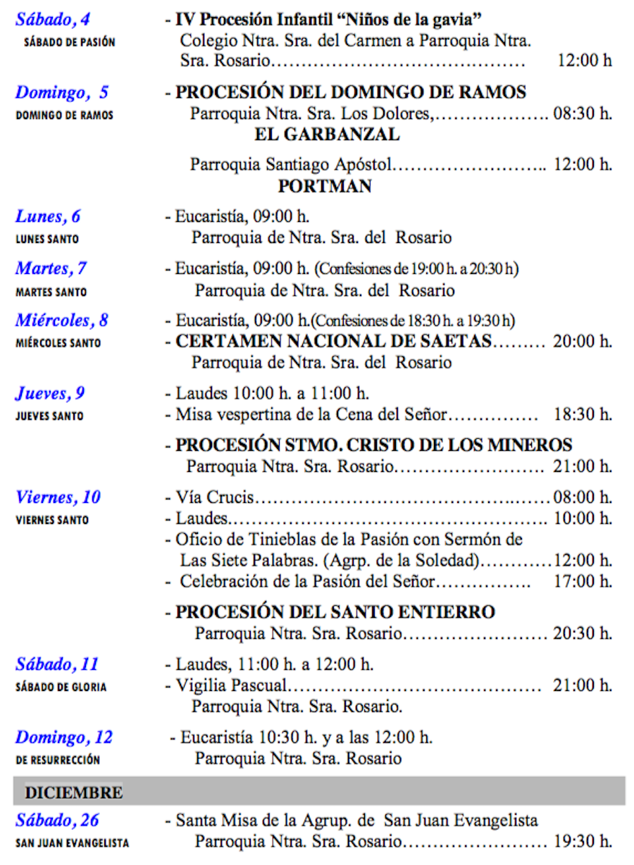 Actos litúrgicos y de culto jalonarán las siguientes fechas junto la presentación de la revista ‘Lignum Crucis’ (20 de marzo) y el Vía Crucis desde la mina Agrupa Vicenta (21 de marzo). Para el día 28 está fijado el pregón que ofrecerá Gonzalo Wandosell en la iglesia de Nuestra Señora del Rosario.