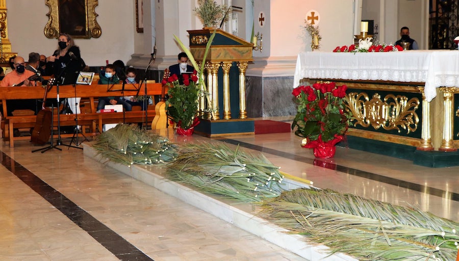 La parroquia ha estructurado la celebración de hoy en varias misas para evitar aglomeraciones de fieles, dentro de las normas de seguridad sanitaria frente al coronavirus que se aplican con rigor. Palmas y ramas de olivo han vuelto a estar presentes en la jornada que rememora la entrada de Jesús en Jerusalén.