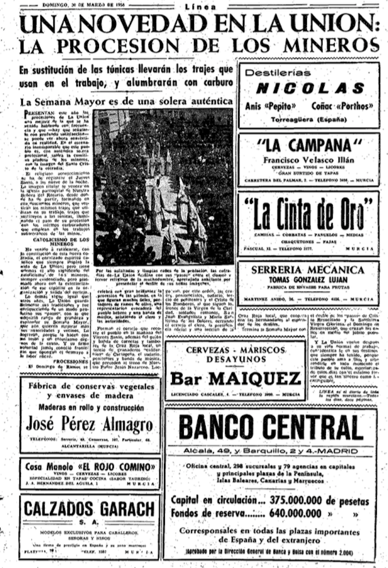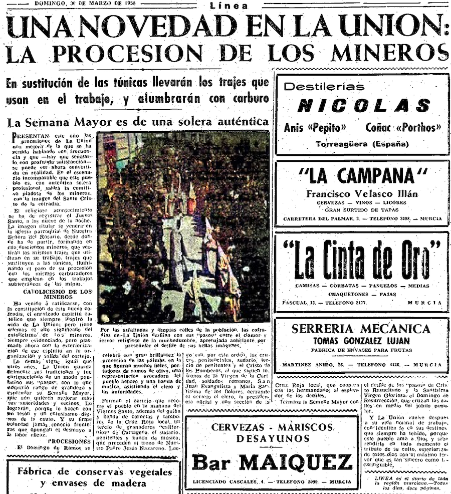 'Una novedad en La Unión: La procesión de los mineros'. Es el título del artículo publicado en el diario Línea del domingo 30 de marzo de 1958, que iba acompañado de dos subtítulos: 'En sustitución de las túnicas llevarán los trajes que usan en el trabajo y alumbrarán con carburo' y 'La Semana Mayor es de una solera auténtica'.