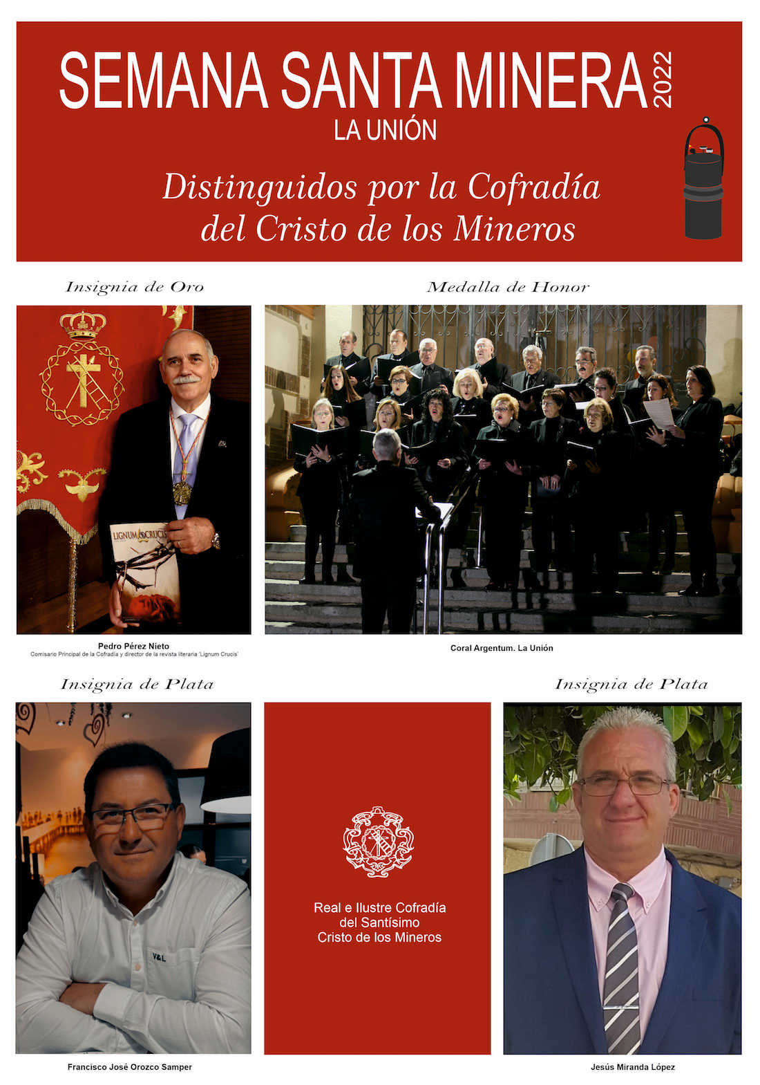 La hermandad procesionista, a propuesta de su hermano mayor, Juan Antonio Pérez Campillo concederá en la cena presentación del cartel del próximo viernes sus distinciones anuales. Insignia de oro para Pedro Pérez Nieto, director de la revista literaria ‘Lignum Crucis' y comisario principal de la hermandad; medalla de honor para la Coral Argentum de La Unión; e insignias de plata para Francisco José Orozco Samper y Jesús Miranda López.