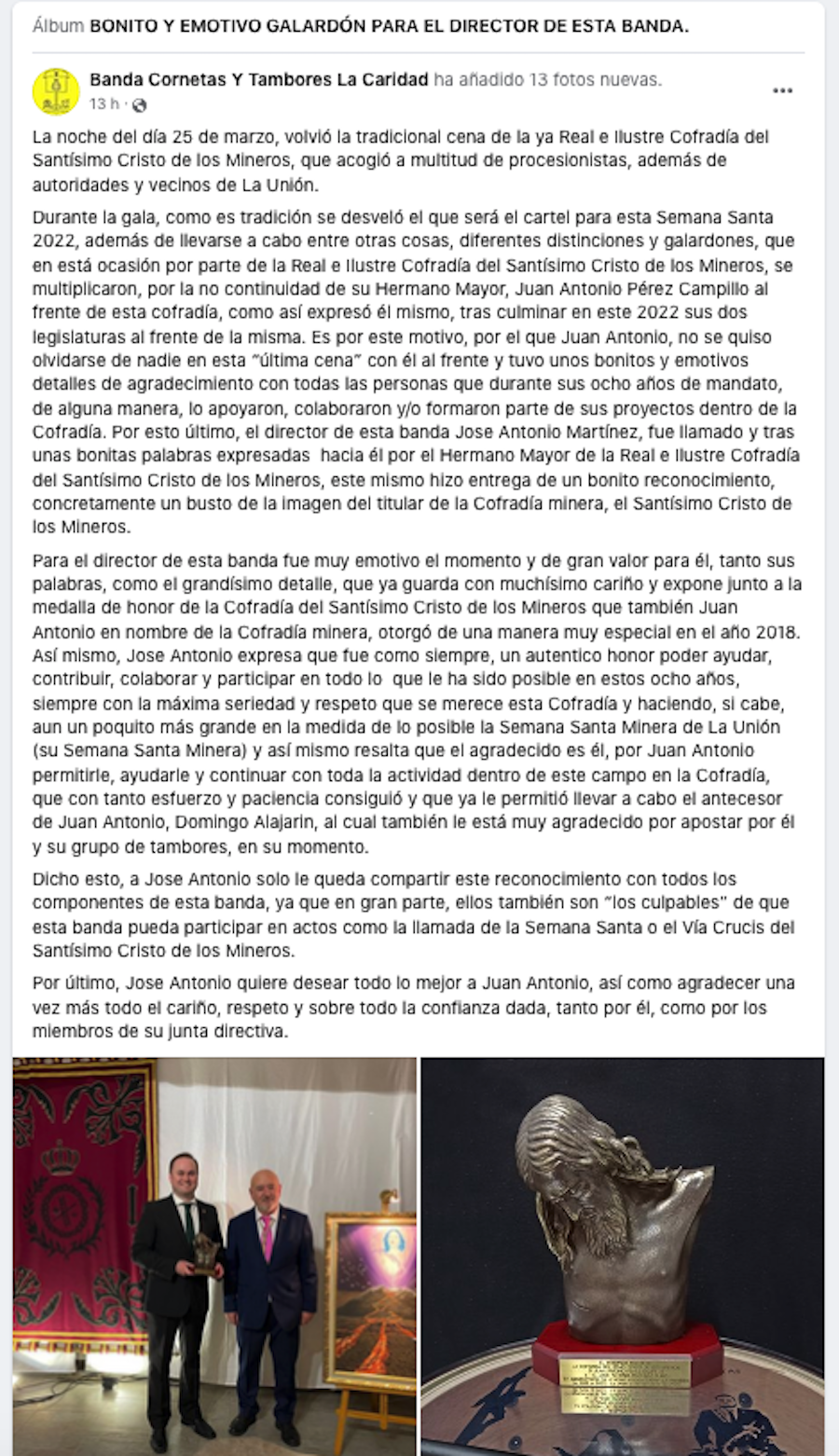 El director el colectivo unionense de cornetas y tambores, José Antonio Martínez, comparte con todos los integrantes el detalle que le entregó el hermano mayor en la cena-gala de la Cofradía del Cristo de los Mineros, en la que anunció su intención de dejar el cargo. Martínez indica que el agradecimiento es para Pérez Campillo por el cariño, respeto y confianza dada a la banda.