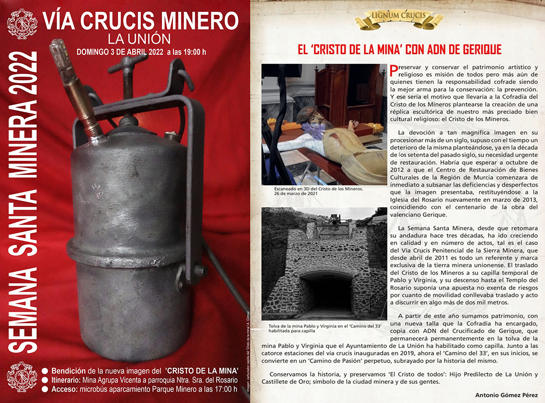 La Semana Santa Minera, desde que retomara su andadura hace tres décadas, ha ido creciendo en calidad y en número de actos, tal es el caso del Vía Crucis Penitencial de la Sierra Minera, que desde abril de 2011 es todo un referente y marca exclusiva de la tierra minera unionense. El traslado del Cristo de los Mineros a su capilla temporal de Pablo y Virginia, y su descenso hasta el Templo del Rosario suponía una apuesta no exenta de riesgos por cuanto de movilidad conllevaba traslado y acto a discurrir en algo más de dos mil metros. Hoy el Cristo de la Mina, cubrirá el camino de pasión, regresando de nuevo a su ubicación tras su descender al Templo del Rosario, en esta ocasión la tolva de Pablo y Virginia, en el Camino del 33, a escasos metros de Agrupa Vicenta.