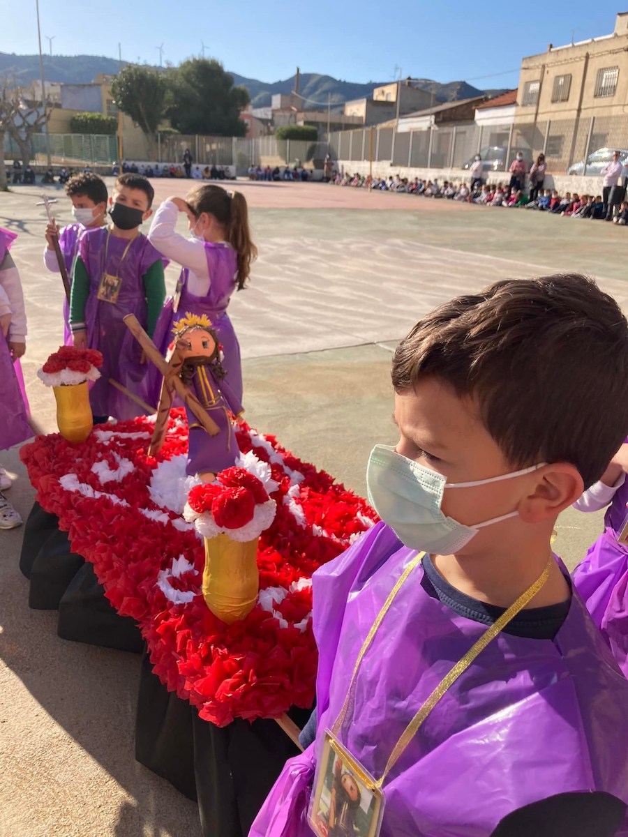 Las diferentes agrupaciones han lucido túnicas confeccionadas de forma doméstica con los tradicionales colores de las agrupaciones, que han desfilado al ritmo de una banda de tambores que marcaba el paso de los tronos. Los numerosos alumnos del centro han ejercido de público con palmas y vítores al paso de las imágenes y han aplaudido la interpretación de un cántico a la Virgen por parte de la alumna de Sexto de Primaria, Lucía del Mar Torrecilla García.