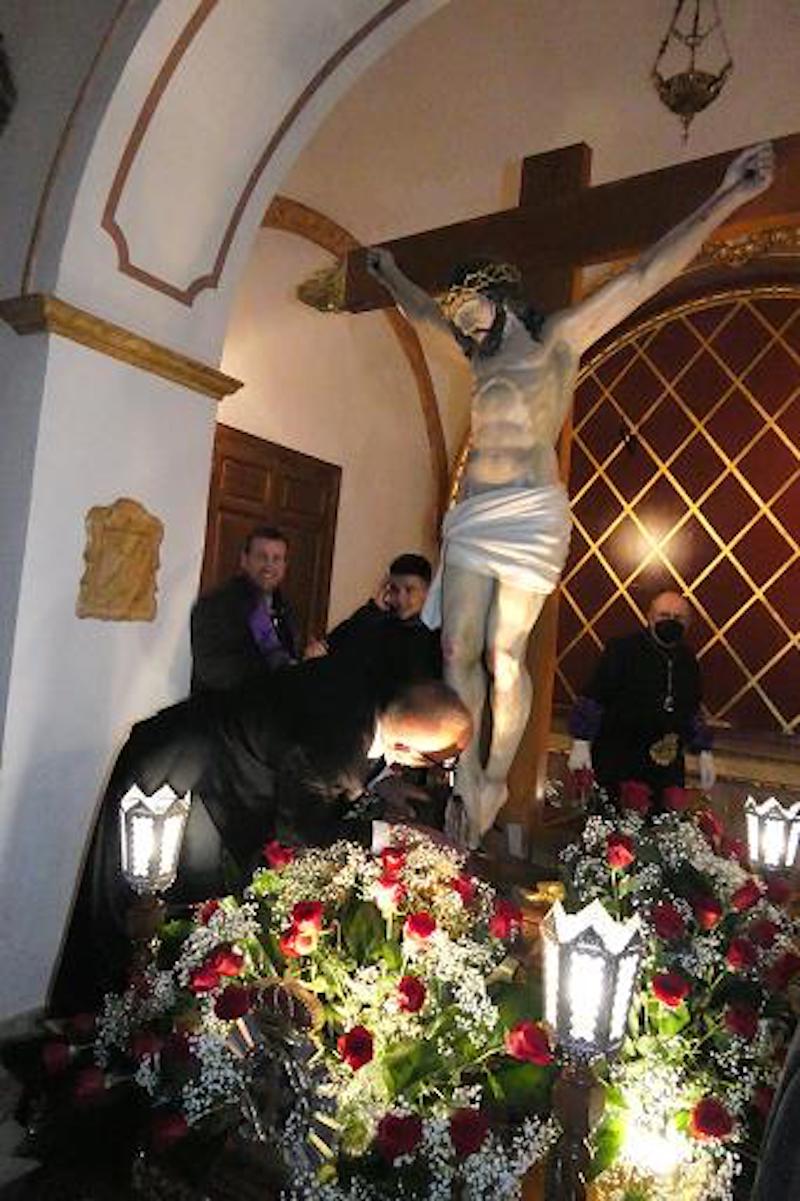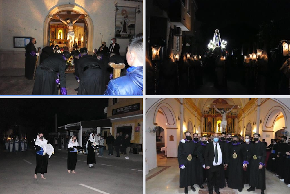 Dos tronos procesionan. En primer lugar, los penitentes con capuz abriendo paso al Cristo del Silencio, que es portado a hombros por los caballeros portapasos, seguido de los fieles que acompañan a la imagen. Tras ellos, los penitentes de la Santísima Virgen de Los Dolores, a la que sigue el trono que también es portado a hombros.