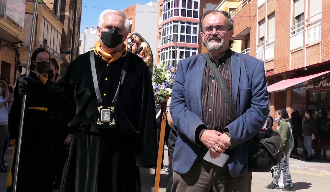 En la foto superior se observa al director del periódico independiente de La Unión durante la procesión de 'Los niños de la gavia' en la Semana Santa Minera de 2022, junto al entonces presidente de la agrupación de la Virgen de la Caridad, Alfonso Almagro.