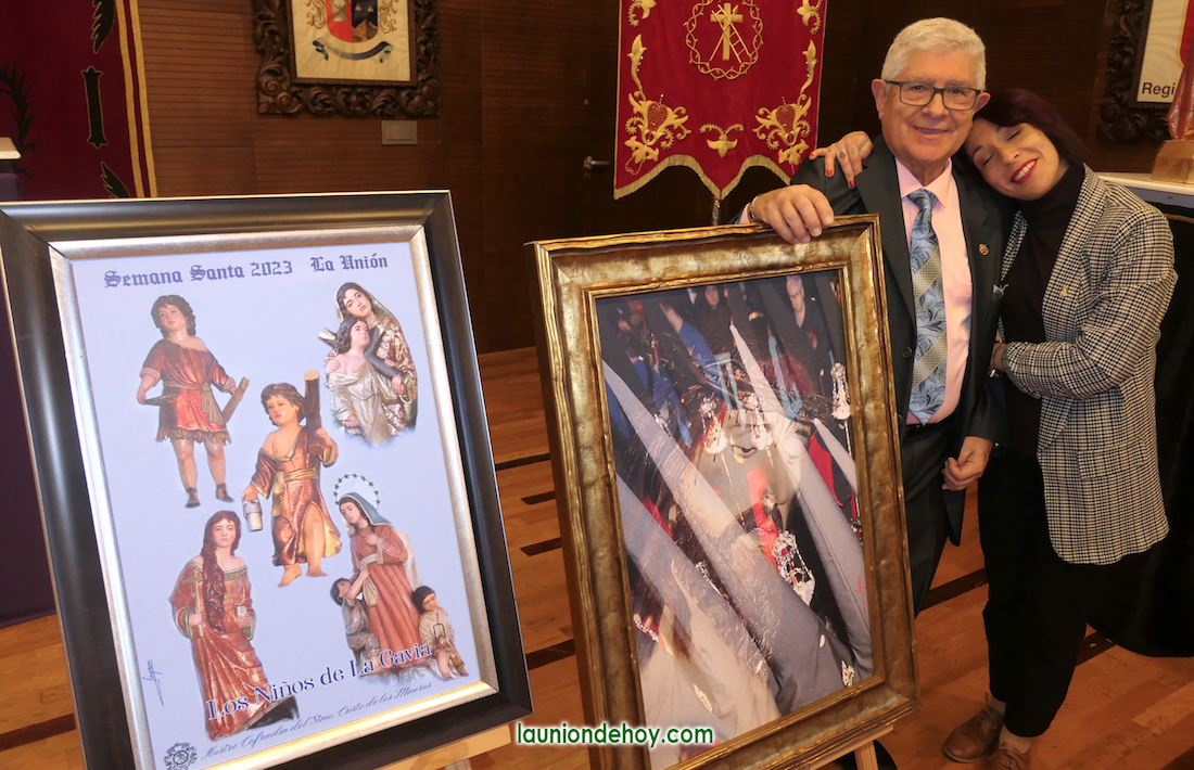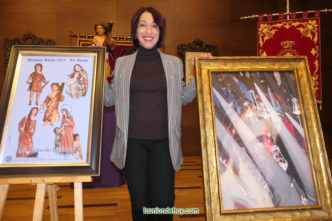 “Cuando me lo propusieron me parecía que era todo un riesgo”, expresó ayer ante el abarrotado salón de actos del Ayuntamiento de La Unión. Sin embargo, era un reto atractivo que no estaba dispuesta a rehusar. “Lo primero que hice es ver carteles de otras semanas santas, pero mi padre me dijo que olvidara todos esos carteles que había visto y que pensara sólo en La Unión y en nuestros desfiles. Así lo hice y se me vinieron a la cabeza los capirotes, por lo que decidí que iban a tener protagonismo. Después busqué una imagen de archivo de Cristo de los Mineros e incluí a la gente para darle vida al cartel”. Así explicó la unionense la gestación de su obra, que, después, ha resultado no ser única, “pues José Cortado (hermano mayor) me pidió otro cartel para la procesión de ‘Los niños de la gavia’ y consideré que, al tratarse del primero que tiene este desfile, deberían ir las cinco imágenes”, continuó explicando, para concluir con la satisfacción de lo que han sido “mis dos primeras creaciones después de mis hijas”. Instantes después subían al escenario las pequeñas Carmen y Lucía, quienes se fundían en un abrazo con su madre.