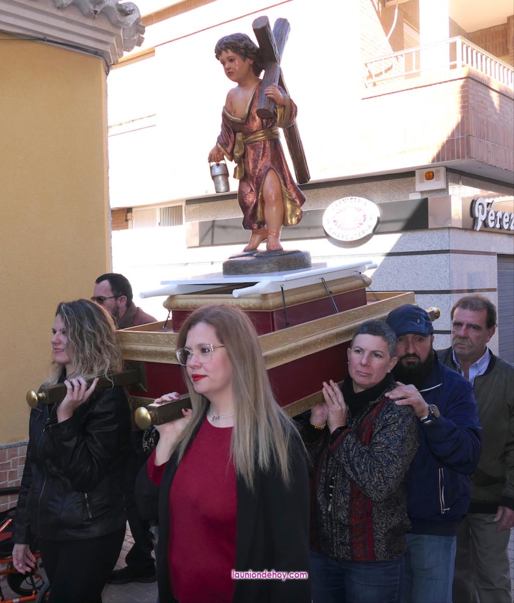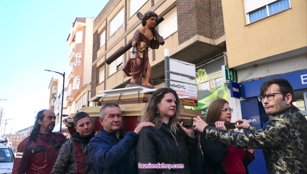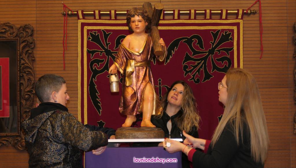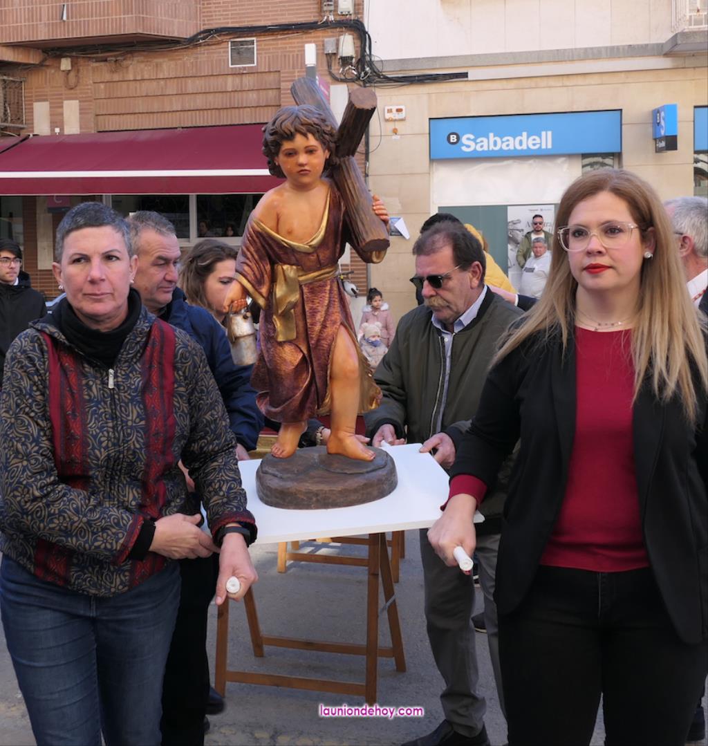San Juan niño salió desde la fundición donde se encuentra el taller de trabajo del escultor Galo Conesa, autor de las tres tallas trasladadas ayer y que formó parte de esta comitiva en compañía del presidente de la agrupación sanjuanista, de la esposa del anterior hermano mayor de la cofradía y del actual, quien más adelante pasó a acompañar al grupo nazareno de 'toda su vida' con la imagen del Jesús Minero.