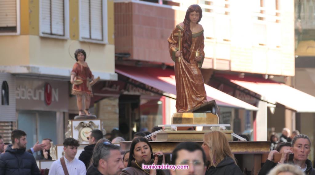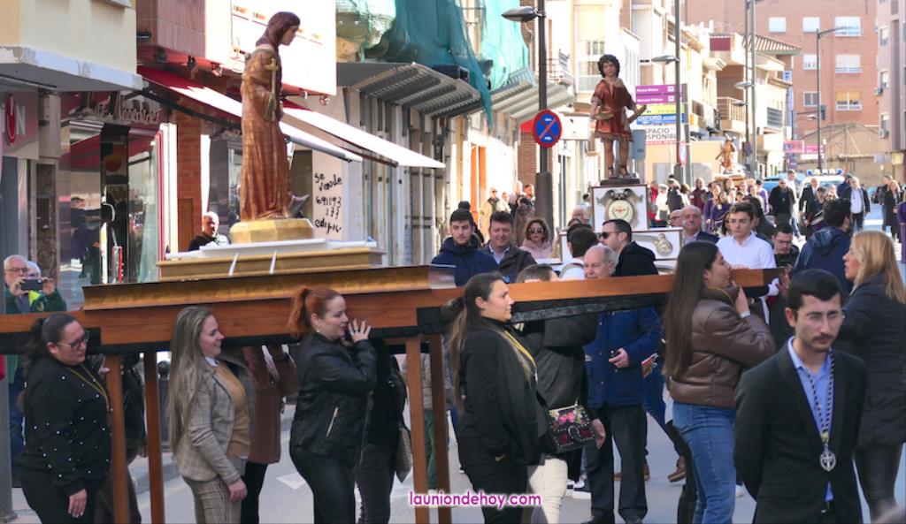 Los tres confluyeron a la altura de la plaza de Joaquín Costa, siendo la Magdalena quien se ubicó en cabeza, seguida por San Juan y cerrando el pequeño minero. Al llegar ante la fachada de la sede del Ayuntamiento, las tallas fueron trasladadas al escenario del salón de actos, donde presidieron el acto del descubrimiento de los carteles oficiales de la Semana Santa Minera de 2023.