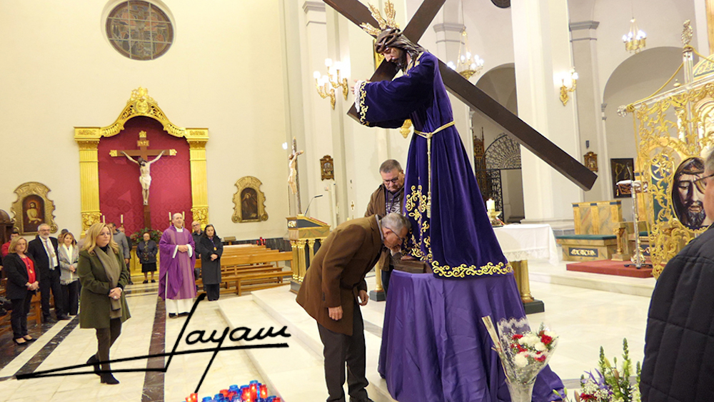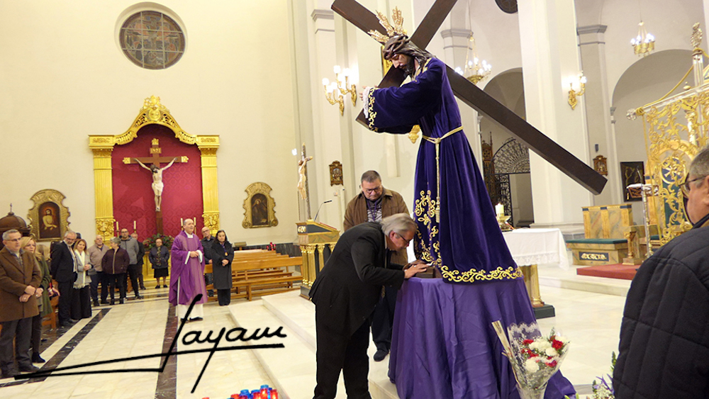 La agrupación de Nuestro Padre Jesús Nazareno de La Unión ha celebrado la tradicional eucaristía de cuaresma, que volvió a incluir, después del paréntesis pandémica, el besapié a la imagen creada por Rigal.