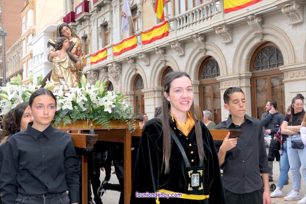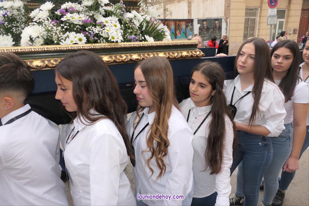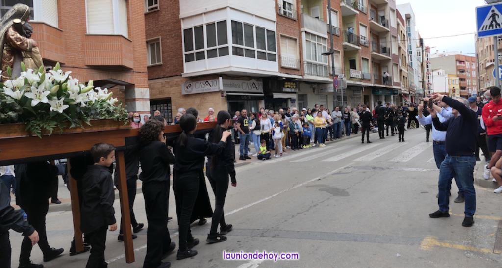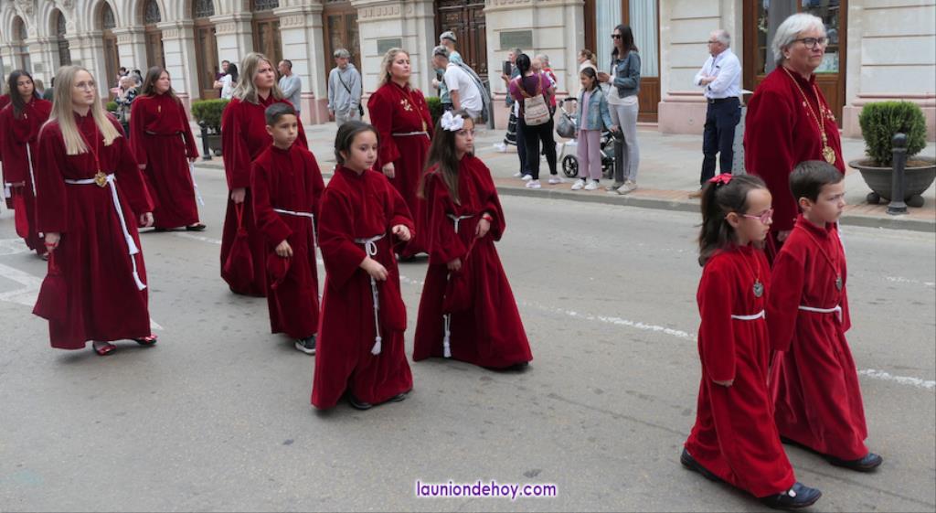 Alrededor de estas tallas, un encanto ver a una cantera que va desde niños muy pequeños a jóvenes que ya demuestran su capacidad procesionista, ya sea en el paso como con el trono, que no dudan en elevar 'al cielo', como ha efectuado el grupo de la Caridad cuando ha pasado junto a la mesa donde estaban, como público, el anterior hermano mayor (Juan Antonio Pérez Campillo) y su anterior presidente (Alfonso Almagro).