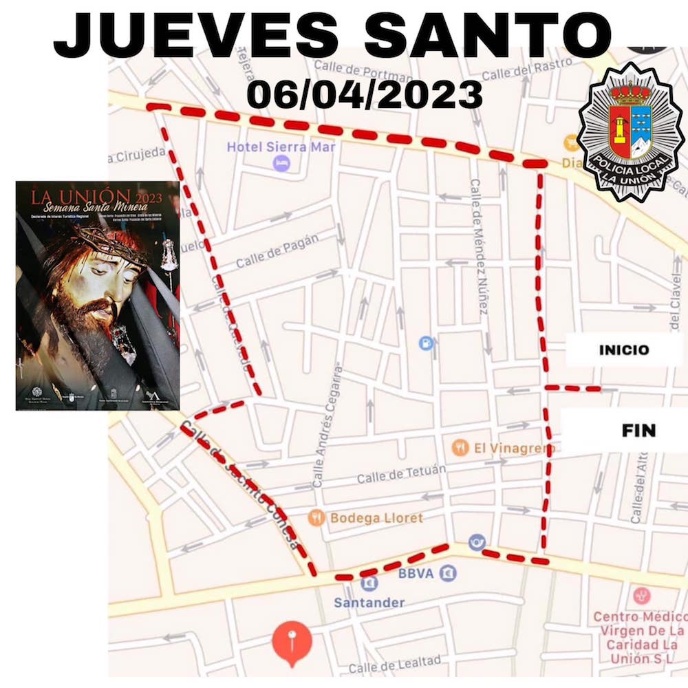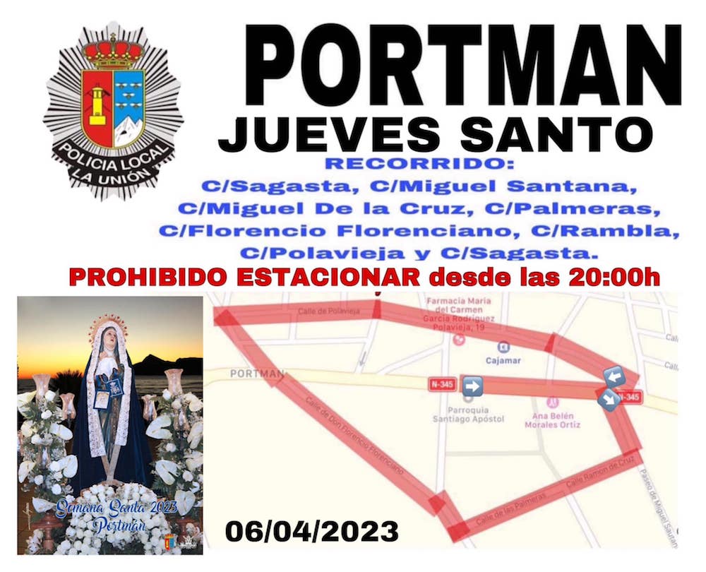 Horarios de los actos litúrgicos en el templo de la Virgen del Rosario de La Unión y salida de la procesión del Cristo de los Mineros. En Portmán, esta tarde es el pregón y a la medianoche comienza el cortejo del silencio. Ofrecemos las indicaciones de la Policía Local con los recorridos de los cortejos pasionarios y las zonas en las que no se puede aparcar en ambas poblaciones.