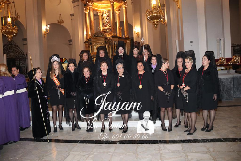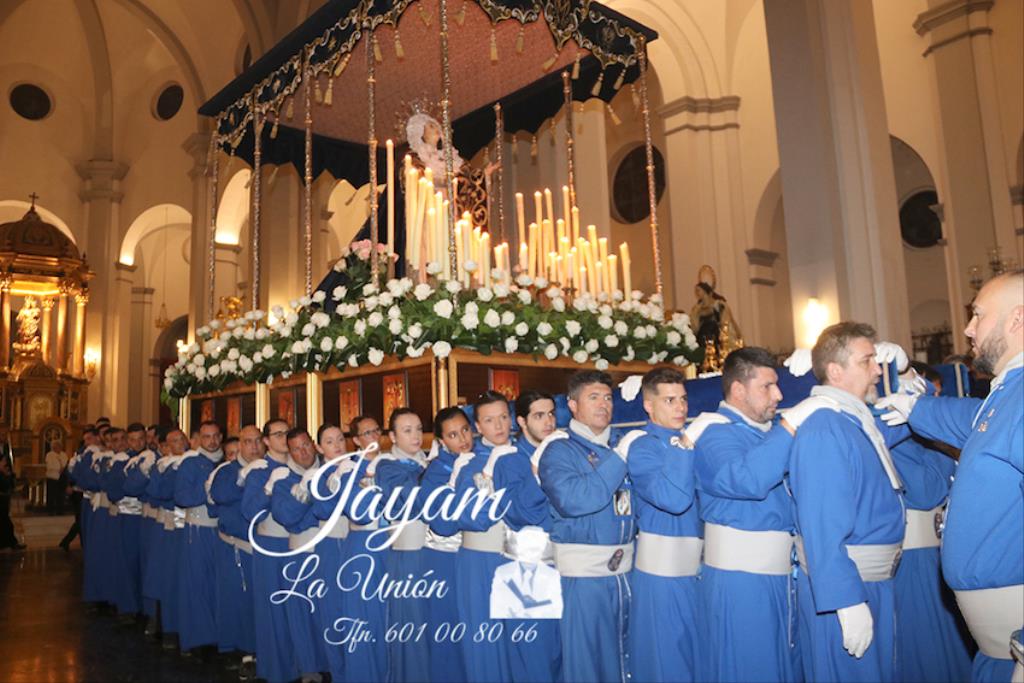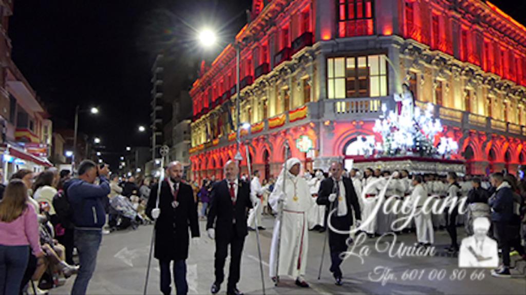 El siguiente en cruzar el pórtico de la iglesia fue el tercio infantil y de capirotes del San Juan. El Discípulo Amado marchaba radiante de luz y flor, también sobre hombros de portapasos. Le seguía la imagen más bella de los desfiles de la Semana Santa Minera, obra del escultor unionense Paco Conesa, la Virgen del Rosario en sus Misterios Dolorosos (La Dolorosa), procesionando bajo palio a hombros de los caballeros portapasos y acompañada por los tercios infantil y de penitentes, junto a una gran banda de tambores. La Virgen de la Caridad, también obra del escultor unionense y también sobre hombros, iba detrás con sus originales lámparas mineras.