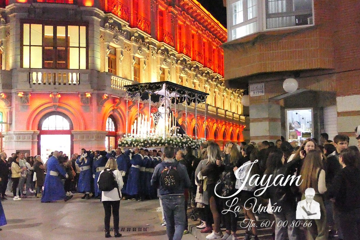 La ciudad vivió anoche su principal procesión de la Semana Santa Minera, que ofreció el pasaje que va desde 'el camino de la cruz' del Nazareno hasta la crucifixión con el Cristo de los Mineros, llevando el cortejo elementos singulares como carburos, picos y palas, entre otros, propios del trabajo en las minas. En la imagen, la Virgen del Rosario pasando junto a una iluminada fachada de la Casa del Piñón. GALERÍA DE FOTOS (pinchar aquí)