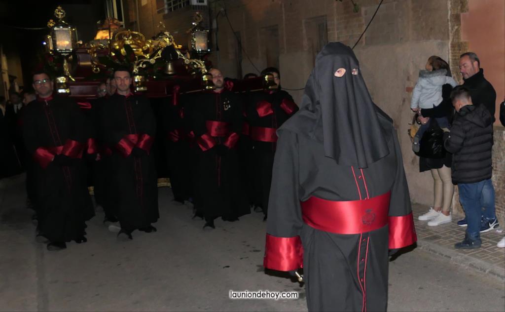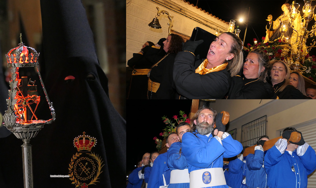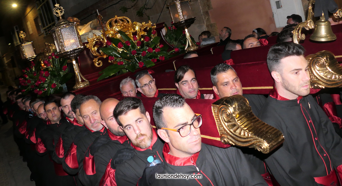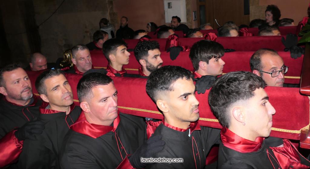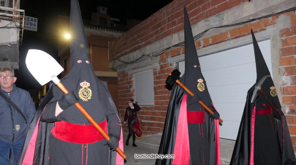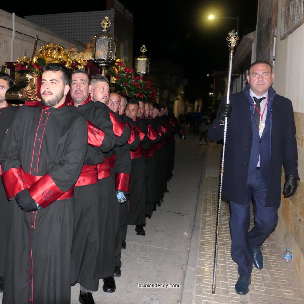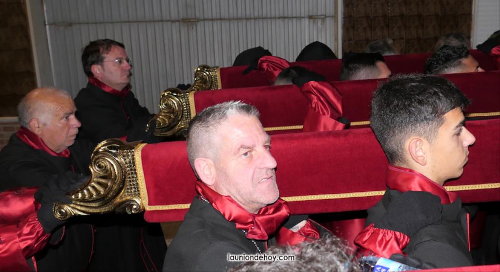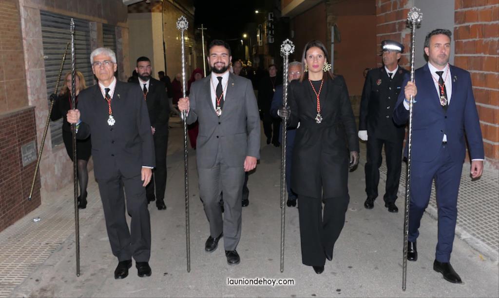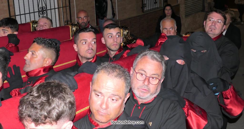 También va el alcalde, pero no se le ve, pues Pedro López marcha metiendo el hombro bajo la segunda vara del Yacente (imagen titular de este desfile que representa el sepelio de Jesucristo) cerca del cajón. Por su parte, en un lateral del mismo trono va el cantaor Sebas Andrue.