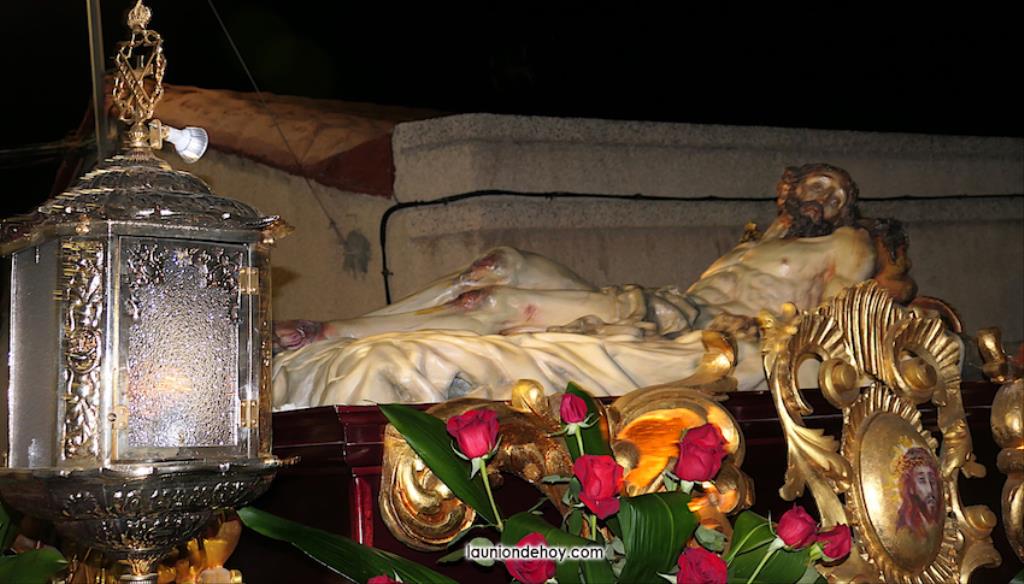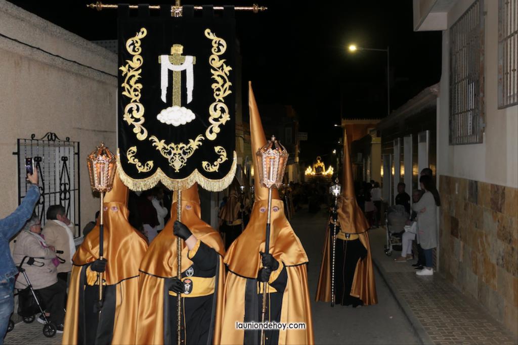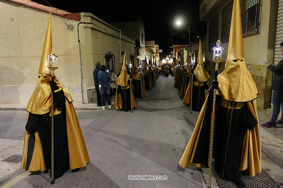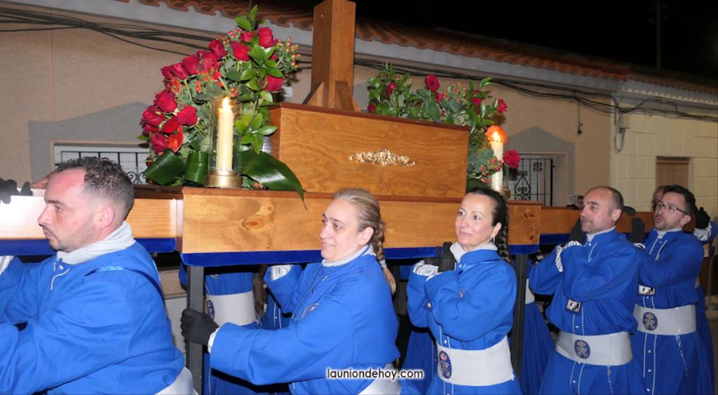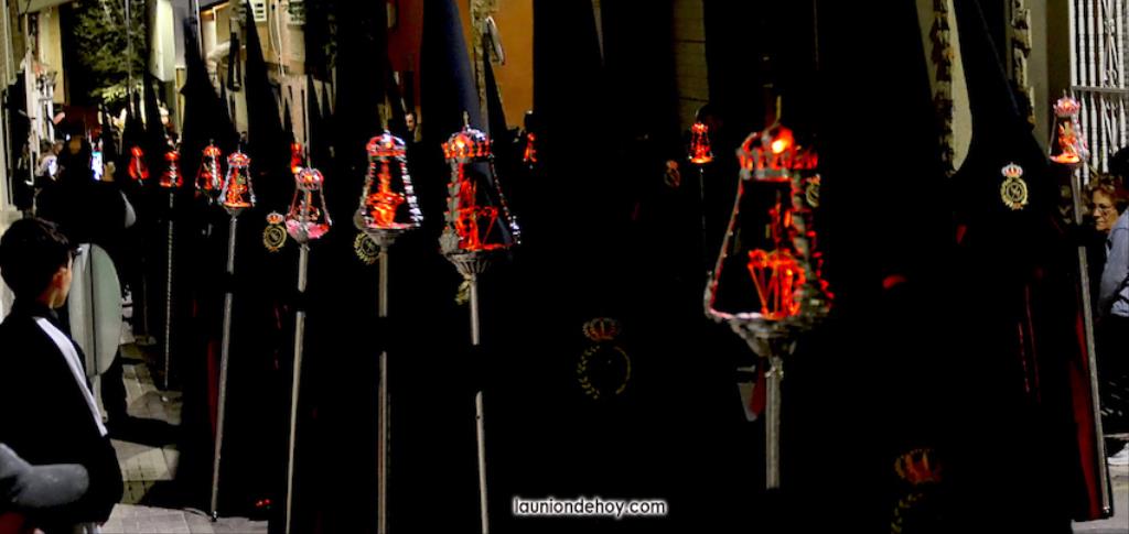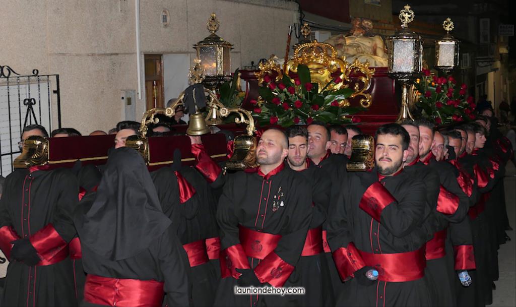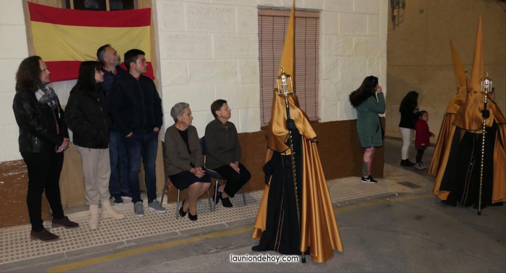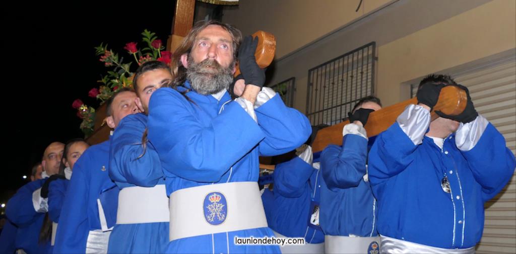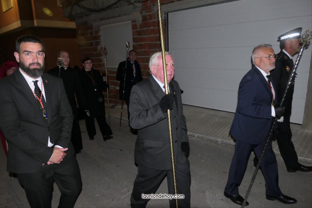 También va el alcalde, pero no se le ve, pues Pedro López marcha metiendo el hombro bajo la segunda vara del Yacente (imagen titular de este desfile que representa el sepelio de Jesucristo) cerca del cajón. Por su parte, en un lateral del mismo trono va el cantaor Sebas Andrue.