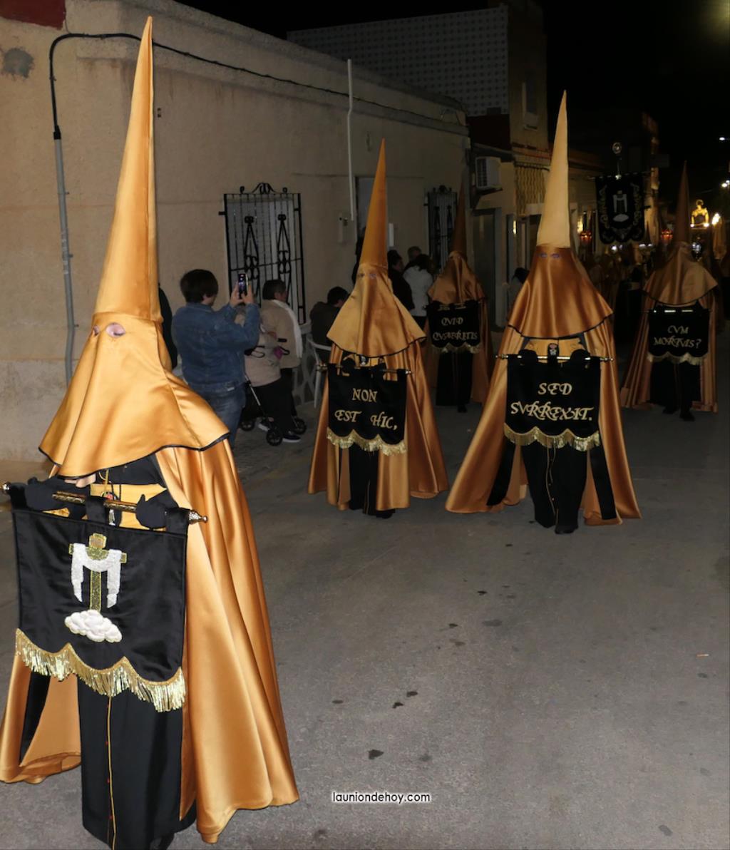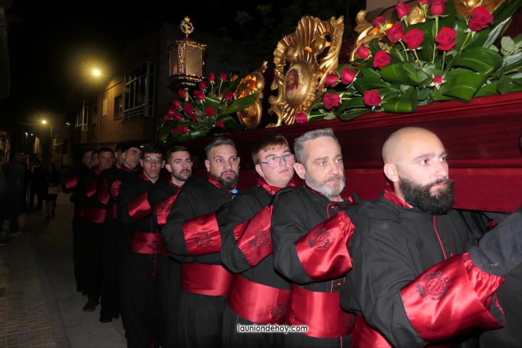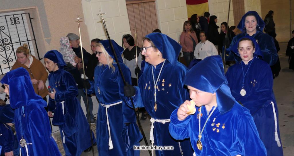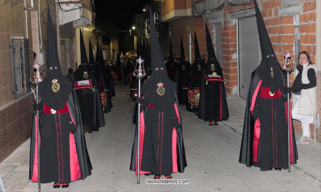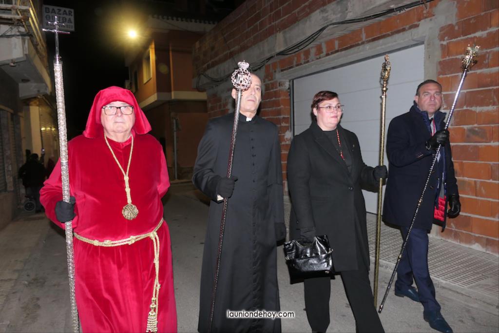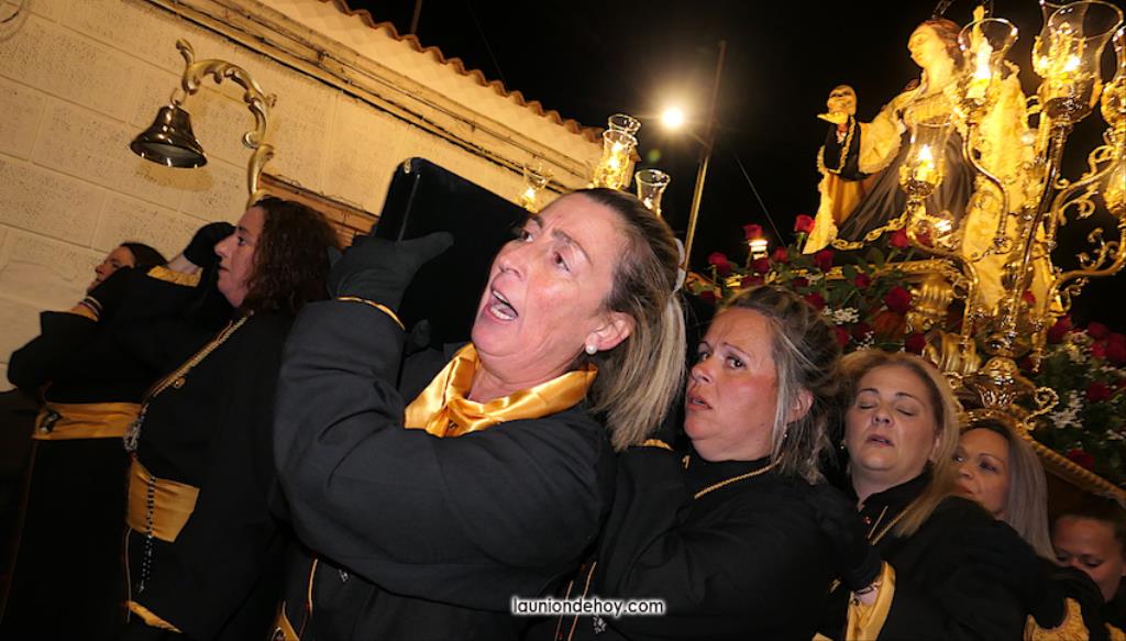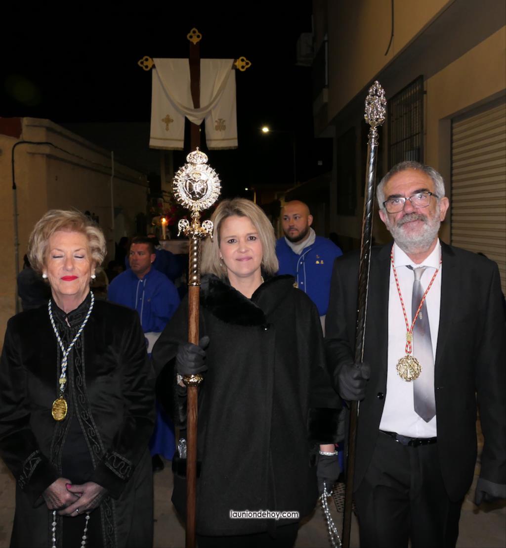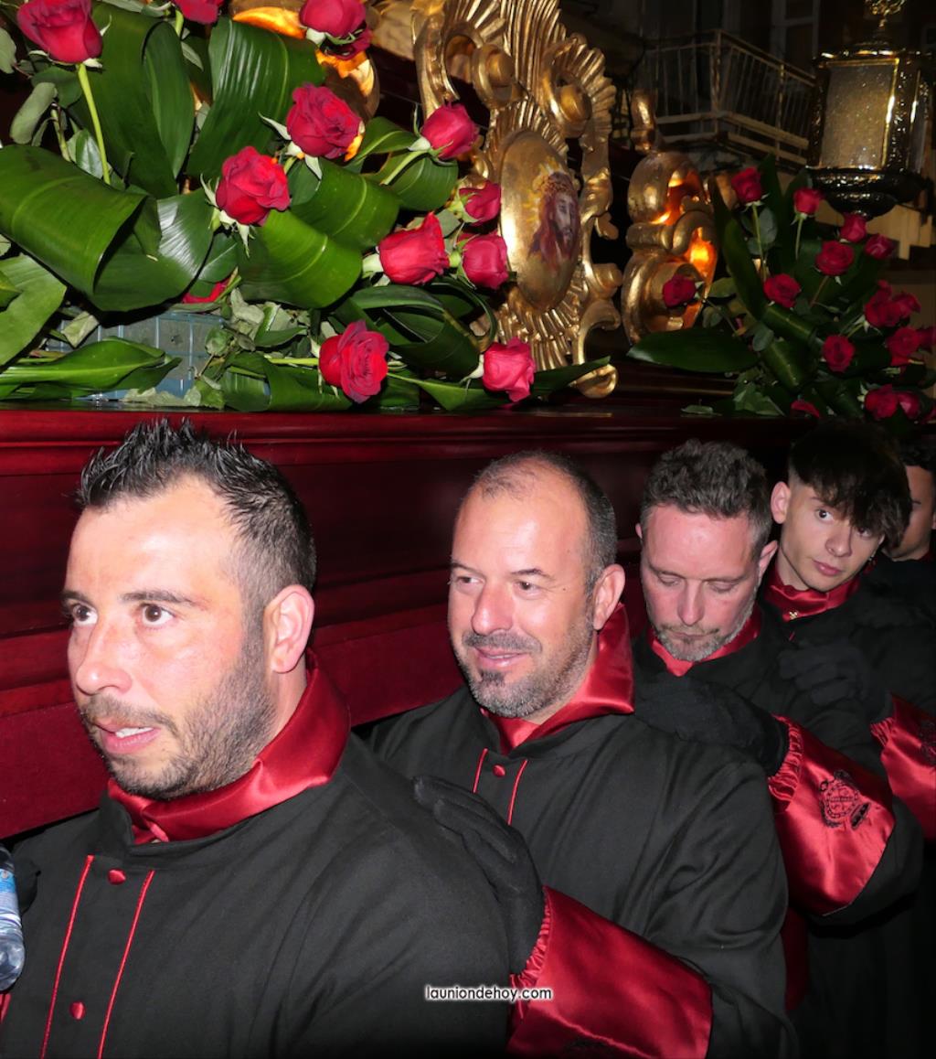 También va el alcalde, pero no se le ve, pues Pedro López marcha metiendo el hombro bajo la segunda vara del Yacente (imagen titular de este desfile que representa el sepelio de Jesucristo) cerca del cajón. Por su parte, en un lateral del mismo trono va el cantaor Sebas Andrue.