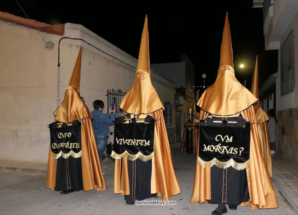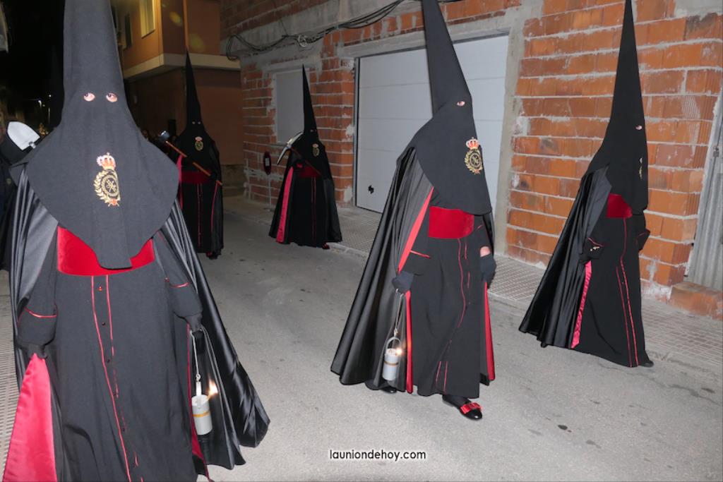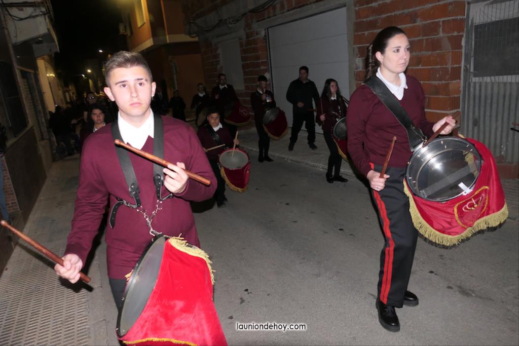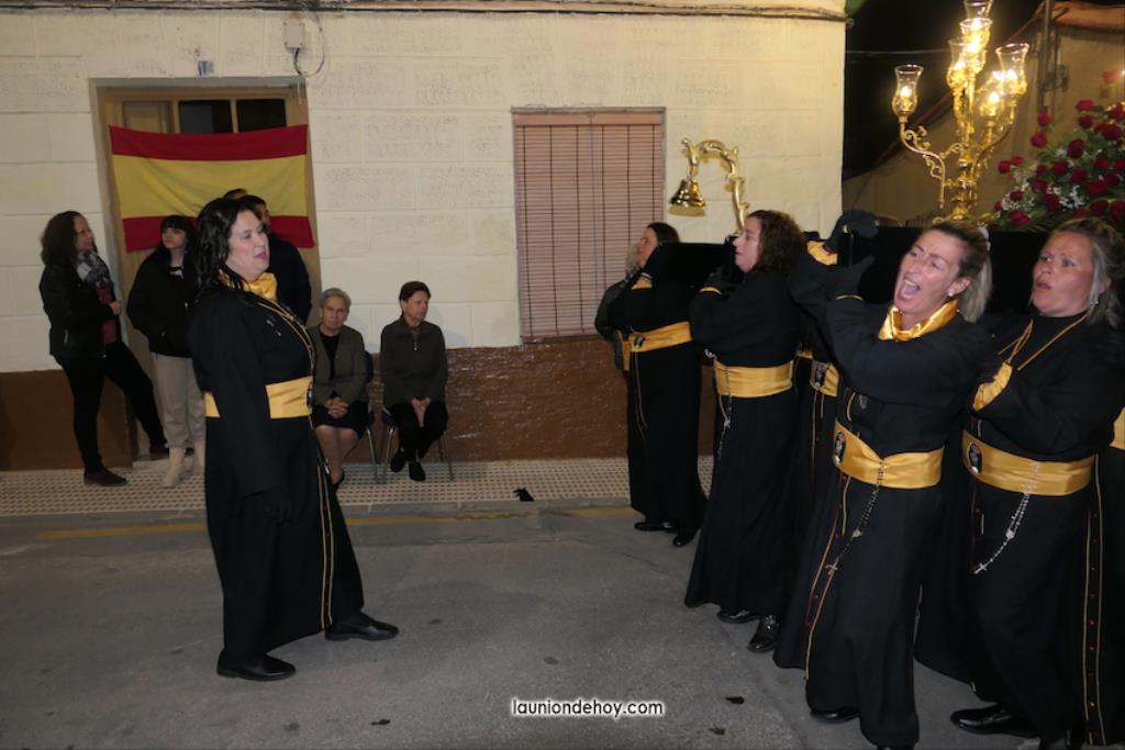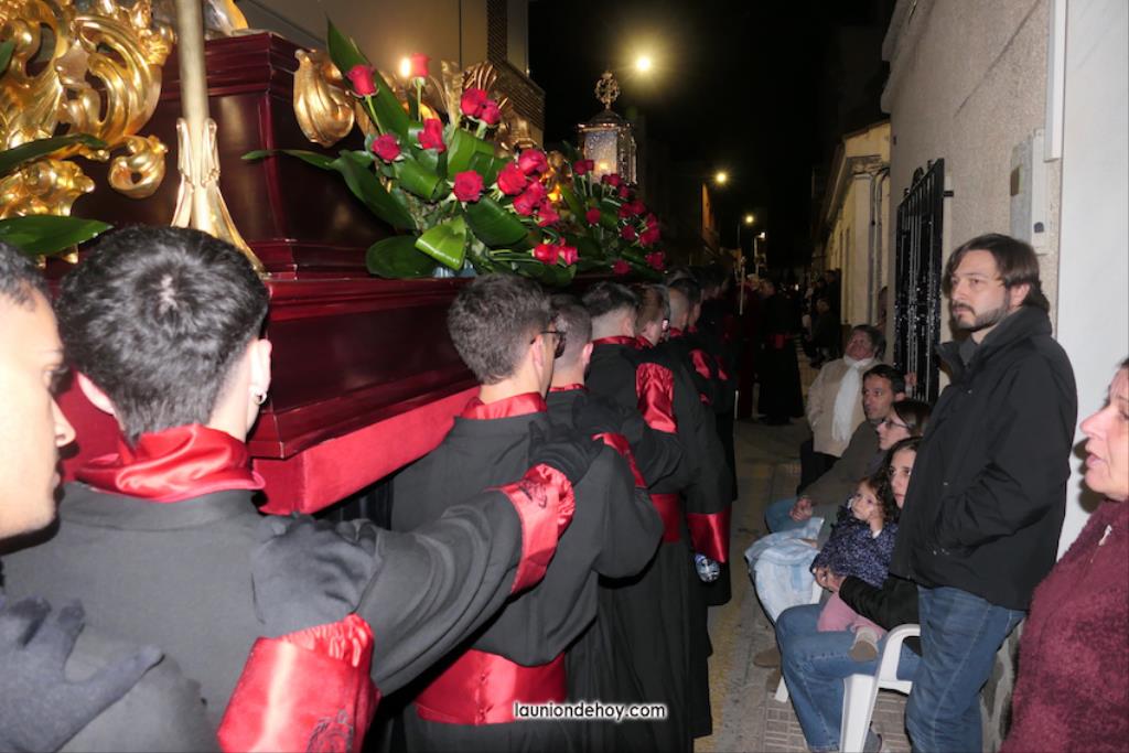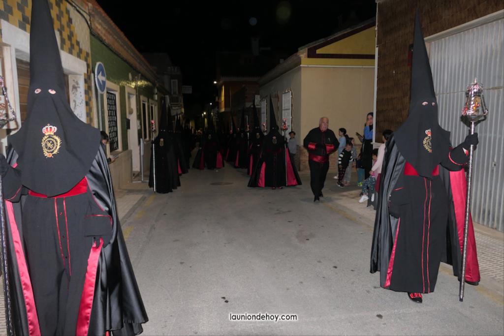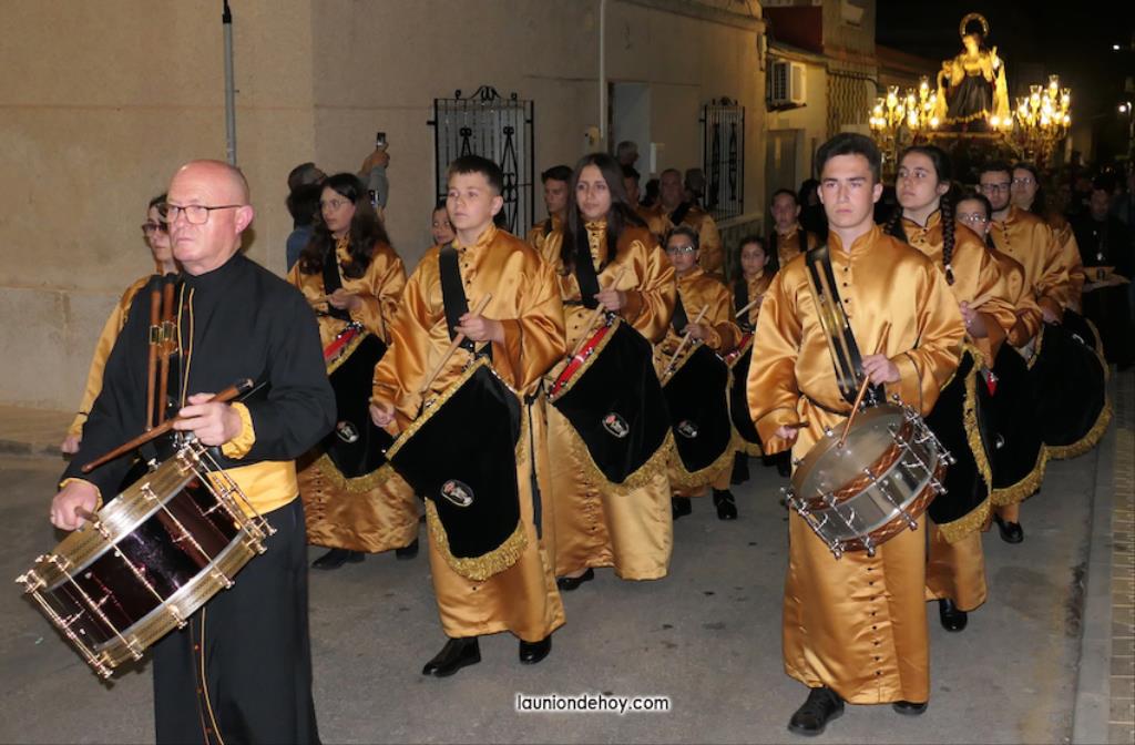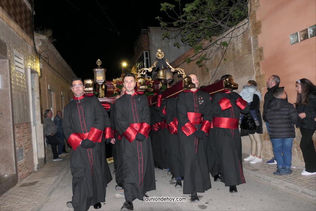 También va el alcalde, pero no se le ve, pues Pedro López marcha metiendo el hombro bajo la segunda vara del Yacente (imagen titular de este desfile que representa el sepelio de Jesucristo) cerca del cajón. Por su parte, en un lateral del mismo trono va el cantaor Sebas Andrue.