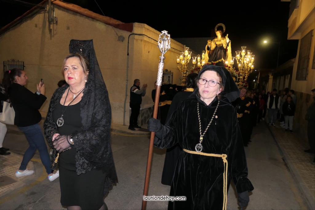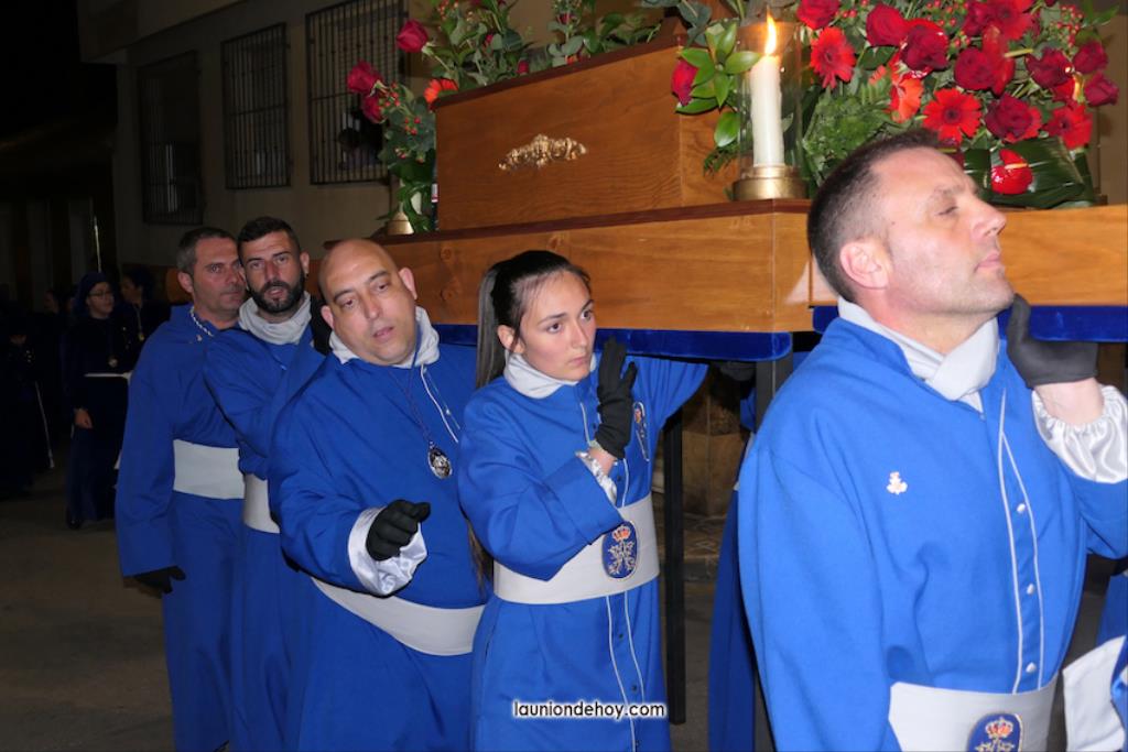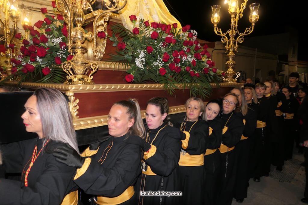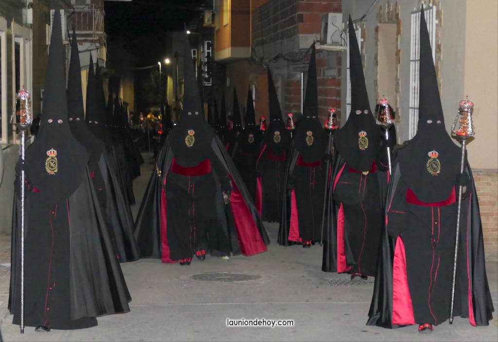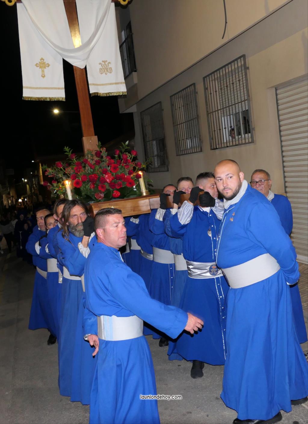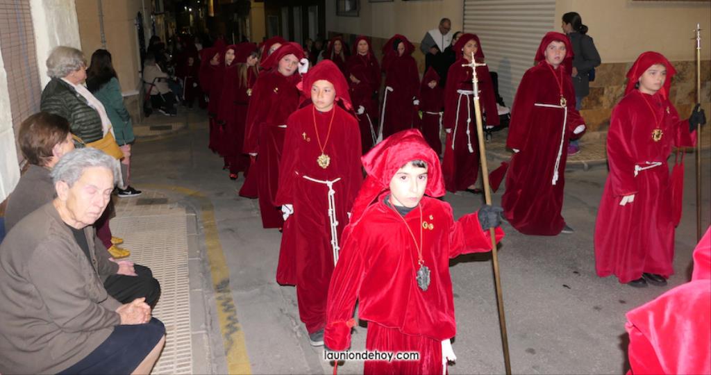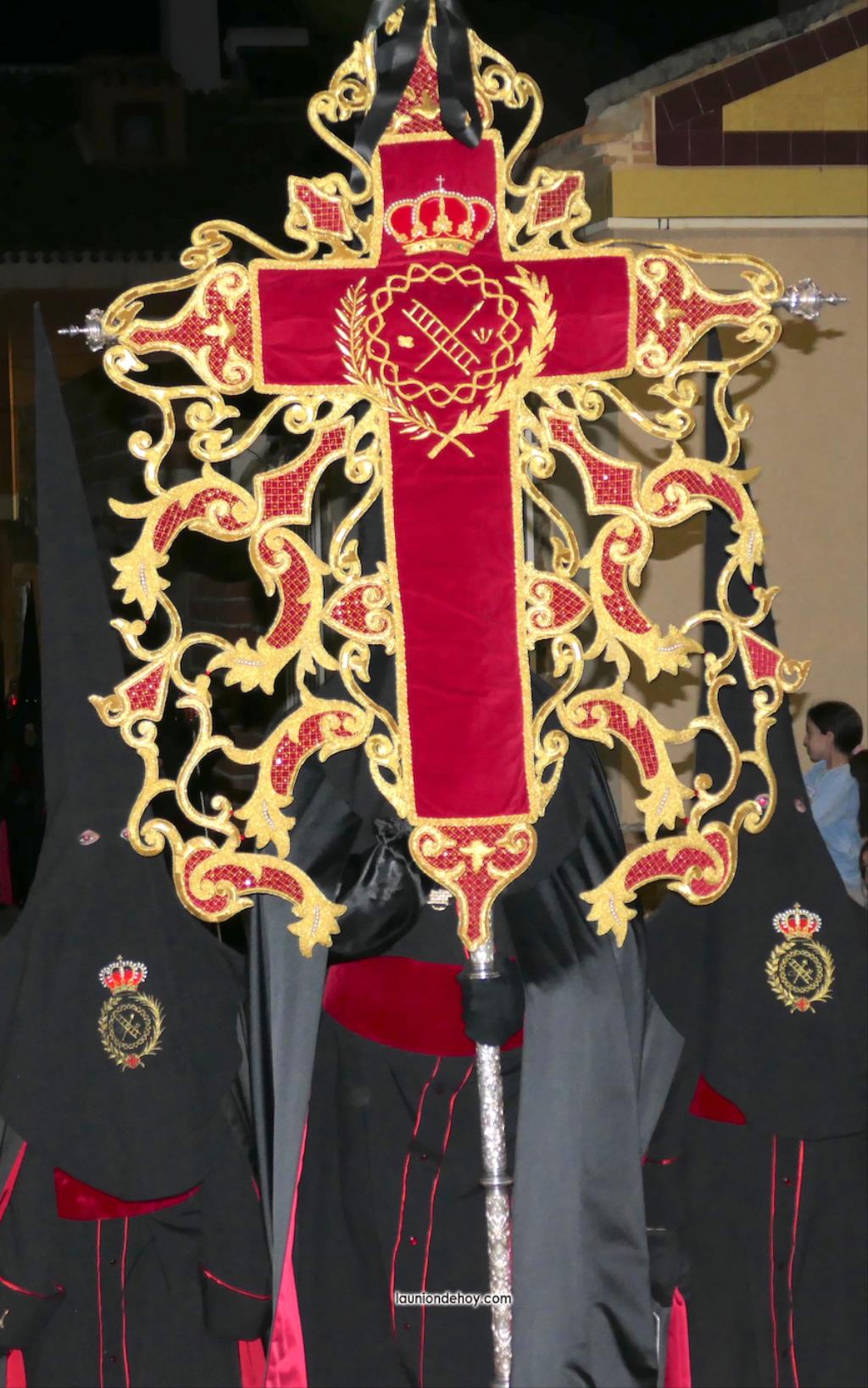 También va el alcalde, pero no se le ve, pues Pedro López marcha metiendo el hombro bajo la segunda vara del Yacente (imagen titular de este desfile que representa el sepelio de Jesucristo) cerca del cajón. Por su parte, en un lateral del mismo trono va el cantaor Sebas Andrue.