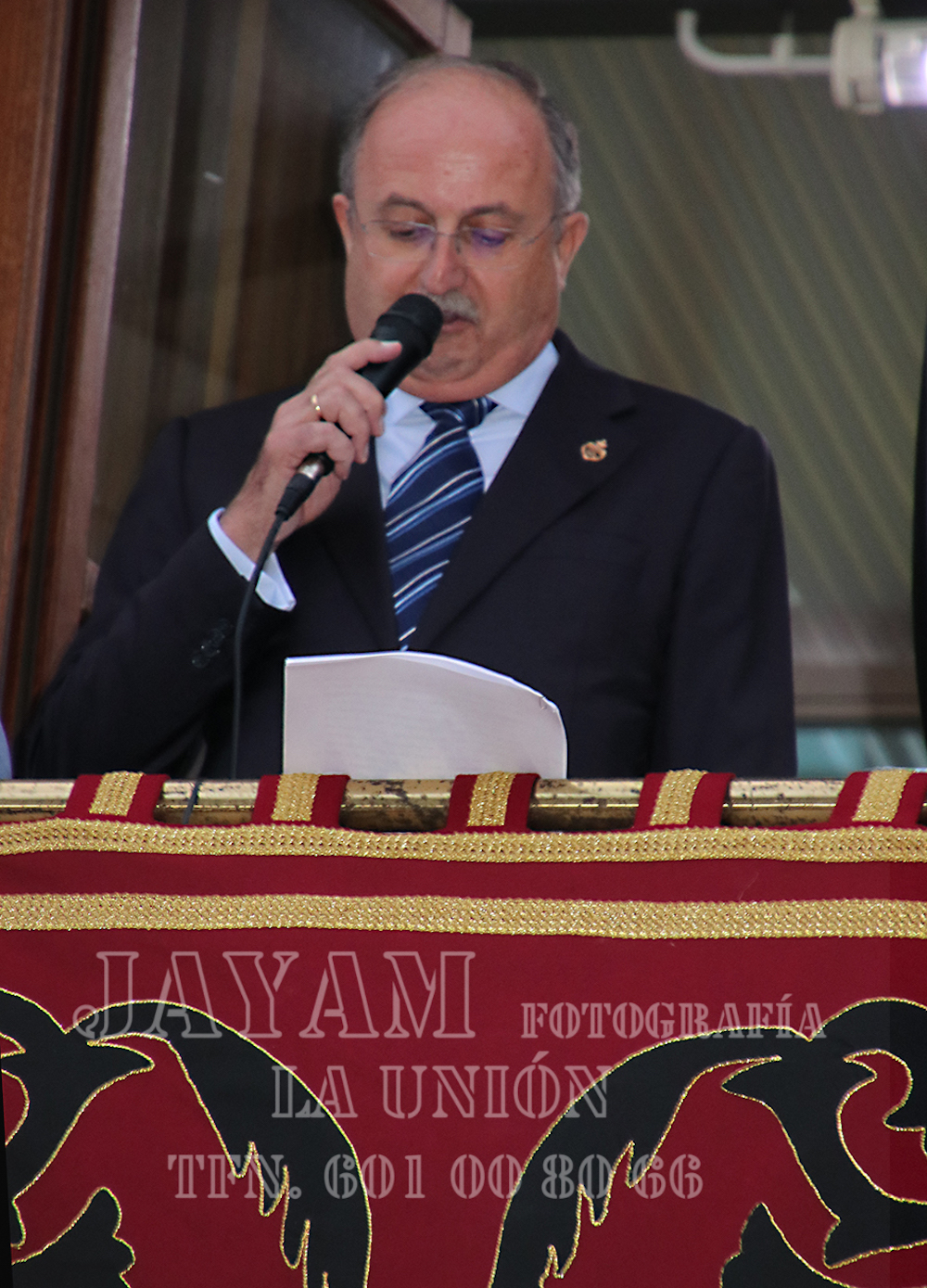 Su discurso iba cargado de cariño hacia La Unión "con palabras que llevan más sentimiento que conocimiento", aunque de estos último no se quedó corto, como reflejó en los numerosos nombres de personas mentadas y de hechos del pasado. Se refirió a la cruz "floreada y minera" montada por el Ayuntamiento en la fachada de la Casa del Piñón y al lugar desde donde ofreció oratoria, el mismo balcón en el que estuvo hace 45 años en la casa de la familia Barrionuevo con motivo de una nochevieja.