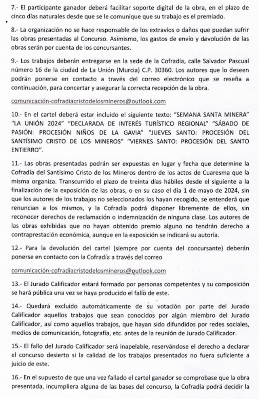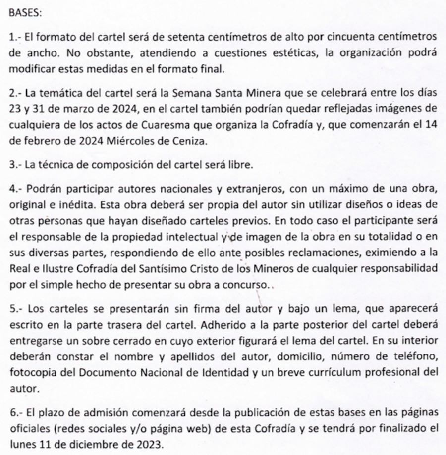 La Real e Ilustre Cofradía del Santísimo Cristo de los Mineros convoca el primer certamen para la imagen oficial que anuncie las procesiones de 2024, que tendrán lugar del 23 al 31 de marzo. El plazo para presentar los trabajos expirará el 11 de diciembre próximo. En la foto adjunta, Carmen Meroño Aguilar, autora del cartel de 2023.