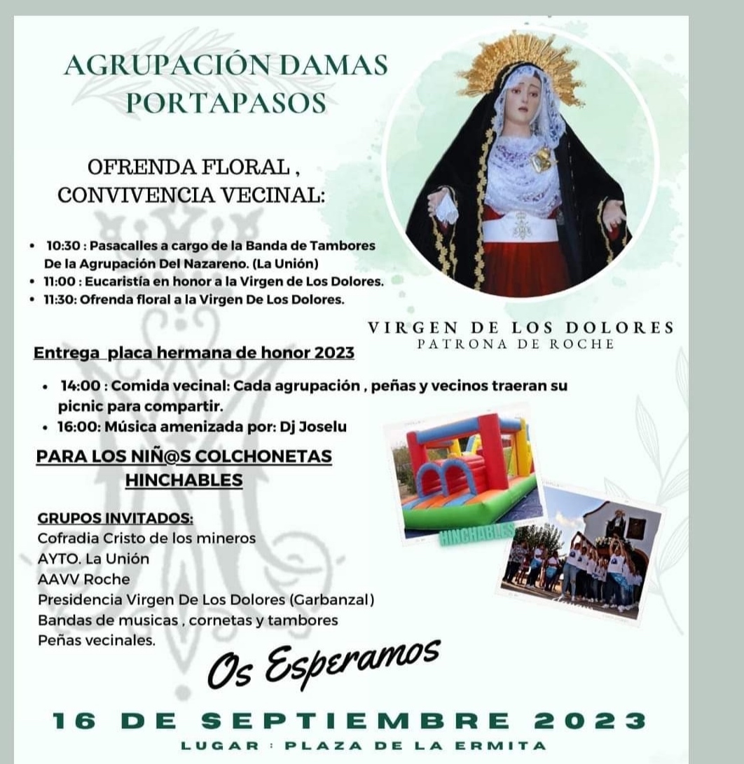 La agrupación de damas portapasos organiza este sábado próximo, con motivo de que esta semana es la festividad de la Virgen de los Dolores, una jornada festiva que comenzará con un pasacalles de la banda de Jesús Nazareno, continuará con misa y ofrenda floral a la patrona del pueblo y culminará con un almuerzo en la paza de la ermita, donde también habrá hinchables para los niños y música con DJ Joselu.