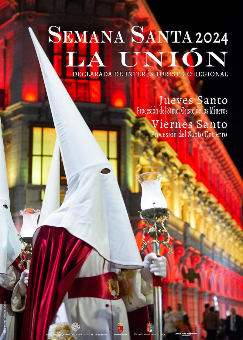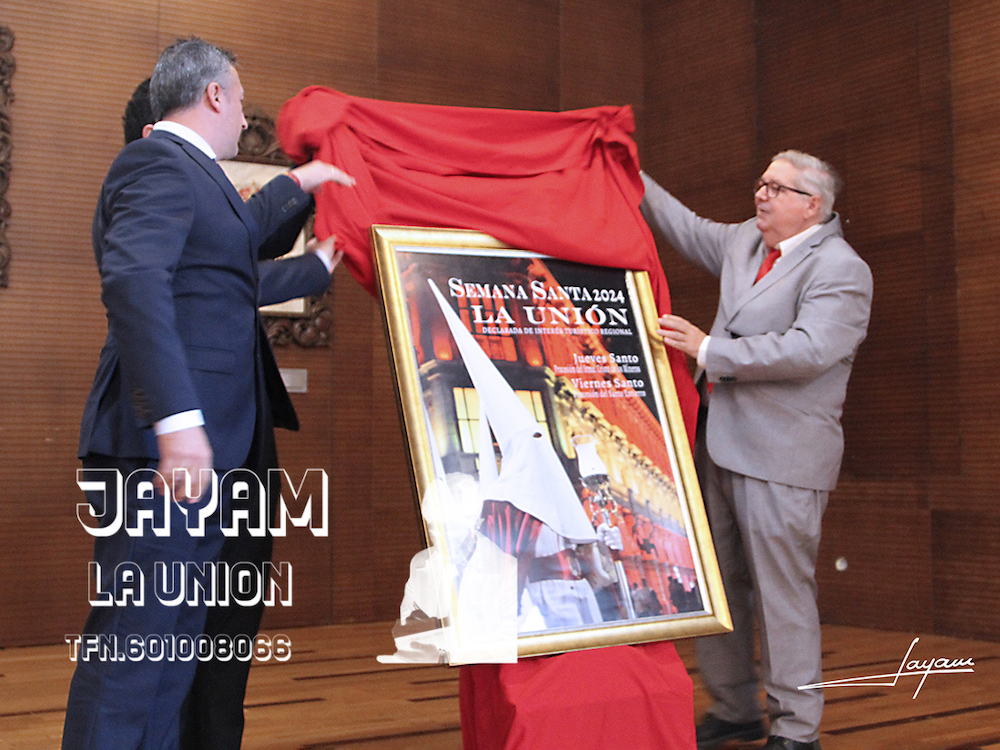 Tras el descubrimiento, el público asistente ha podido poner imagen a la obra, que representará los desfiles pasionarios de la ciudad de La Unión este año. Un trabajo fotográfico que en palabras de su autor, consta de dos elementos únicos y principales. Un penitente perteneciente a la Agrupación de San Juan Evangelista, destacando en él su capuz en diagonal. Al fondo a modo de telón, parte del edificio de la Casa del Piñón, signo de identidad de la ciudad minera. Un edificio de estilo modernista de finales del siglo XIX y paralelo en construcción al apogeo de la minería de La Unión y al esplendor de sus procesiones.