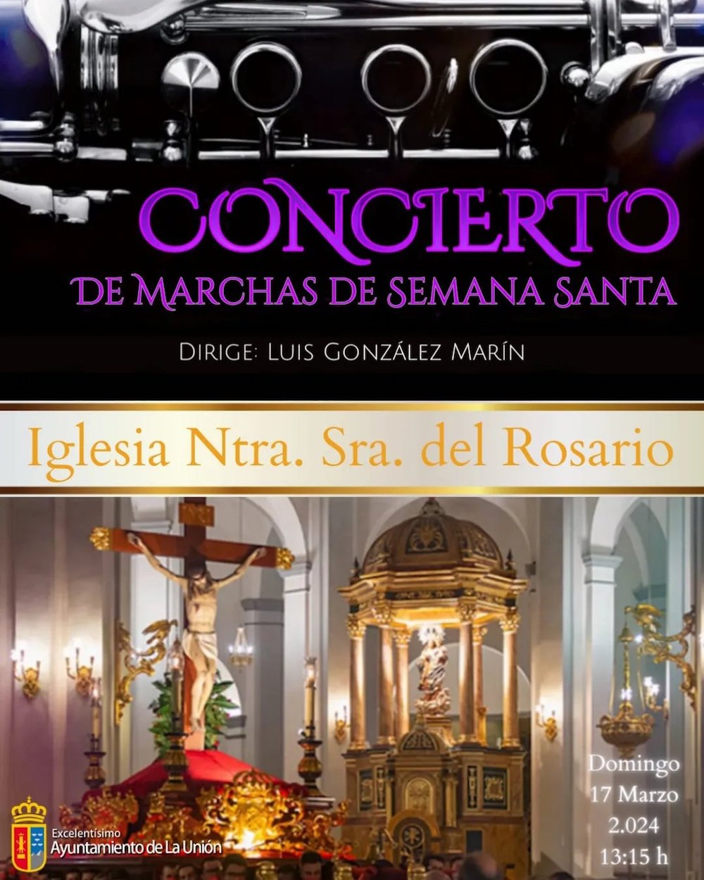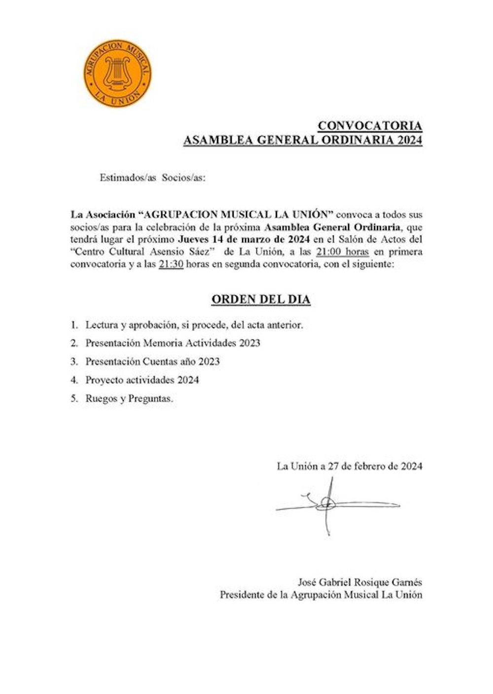 La asociación de La Unión convoca a sus socios para la junta general ordinaria que tendrá lugar el jueves 14 de marzo a las 21 horas, en el centro cultural ‘Asensio Sáez’ . Al domingo siguiente, día 17, la banda titular ofrecerá en la iglesia de Nuestra Señora del Rosario el concierto de marchas de Semana Santa bajo la dirección de Luis González Marín.