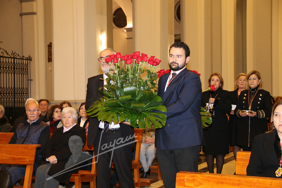 Durante el ofertorio, miembros de la agrupación llevaron a cabo la ofrenda de elementos que procesionan con el tercio y la talla, como el pico y la pala mineros, la corona de espinas y unos centros de flores.