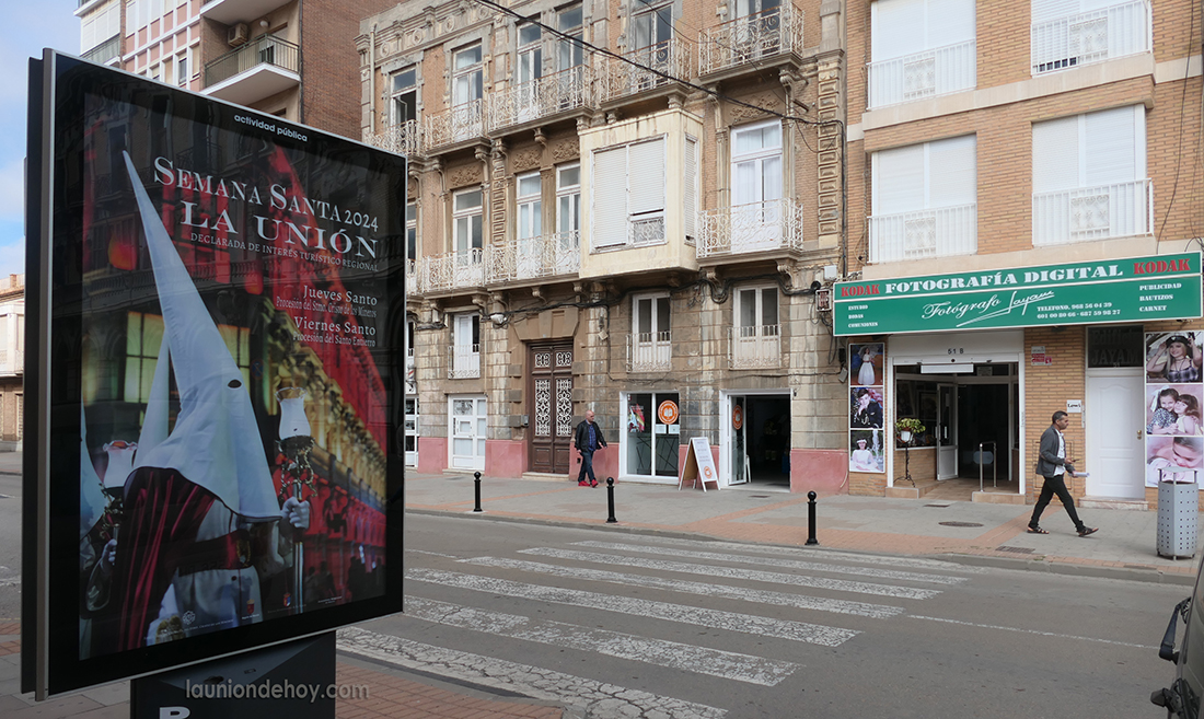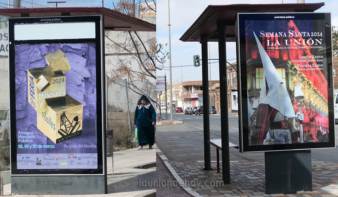 Los mupis de la ciudad de La Unión lucen desde hace unos días los carteles oficiales (obras de Esteban Bernal y Francisco Silvente, respectivamente) de los dos grandes acontecimientos del último tercio de este mes, la Feria de Minerales y Fósiles y la Semana Santa Minera.