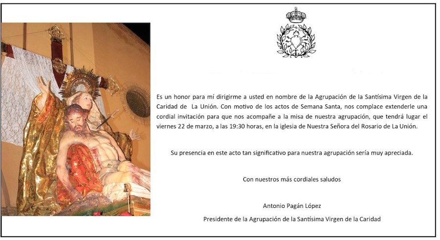 La iglesia de Nuestra Señora del Rosario de la ciudad de La Unión acoge, a partir de las 19.30 horas, la eucaristía en honor a la imagen titular de la agrupación procesionista de la Virgen de la Caridad. Será oficiada por el reverendo Ginés Luis Vicente y amenizada por las saetas de Paco Severo, con José Antonio Martínez con el tambor, ambos unionenses.