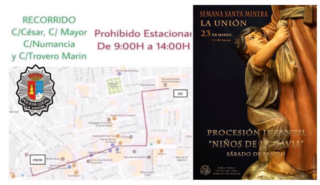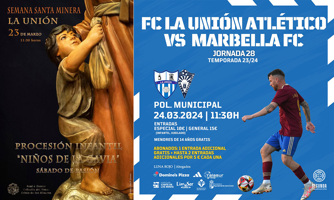 Comienza la Semana Santa Minera con procesión de este sábado, que está dedicada a los niños que trabajaron en las minas de La Unión. Le sucederá al día siguiente el Domingo de Ramos con desfile desde la parroquia de El Garbanzal. En el deporte, juegan en casa La Unión Atlético y el CD Ciudad de La Unión de fútbol. También ofrecemos horarios de fútbol sala y voleibol.