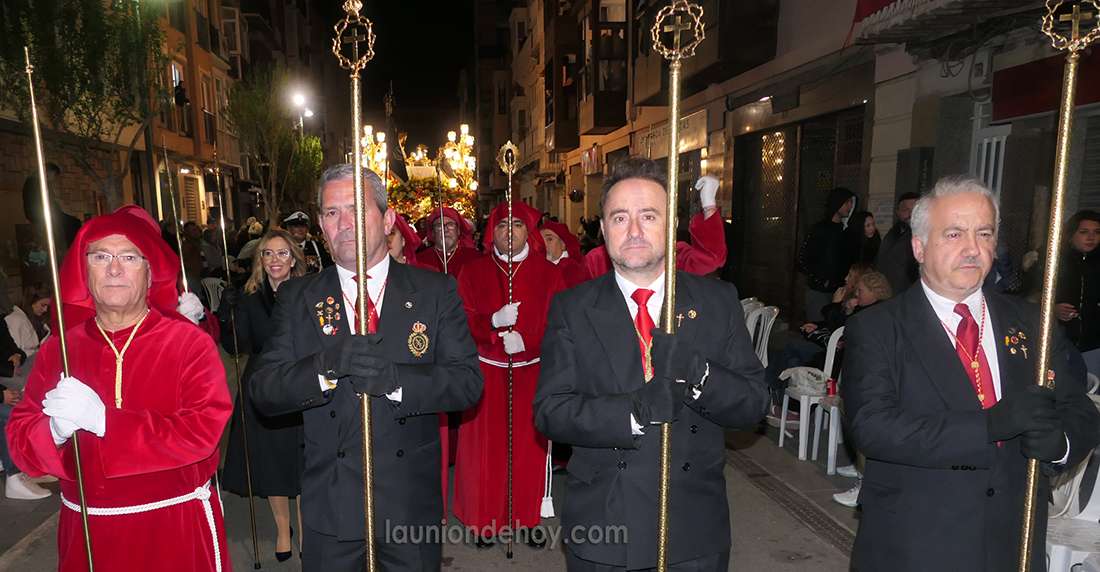 La magna procesión del Cristo del Prendimiento contó con una notable representación de unionenses en diferentes papeles en una noche en la que el fuerte viento complicó mucho su desarrollo. En la foto, el presidente de la agrupación del Cristo de los Mineros de La Unión, Alfonso Castejón, con el paso californio de la Santa Cena y Cristo de los Mineros.