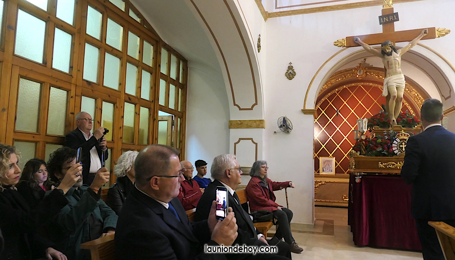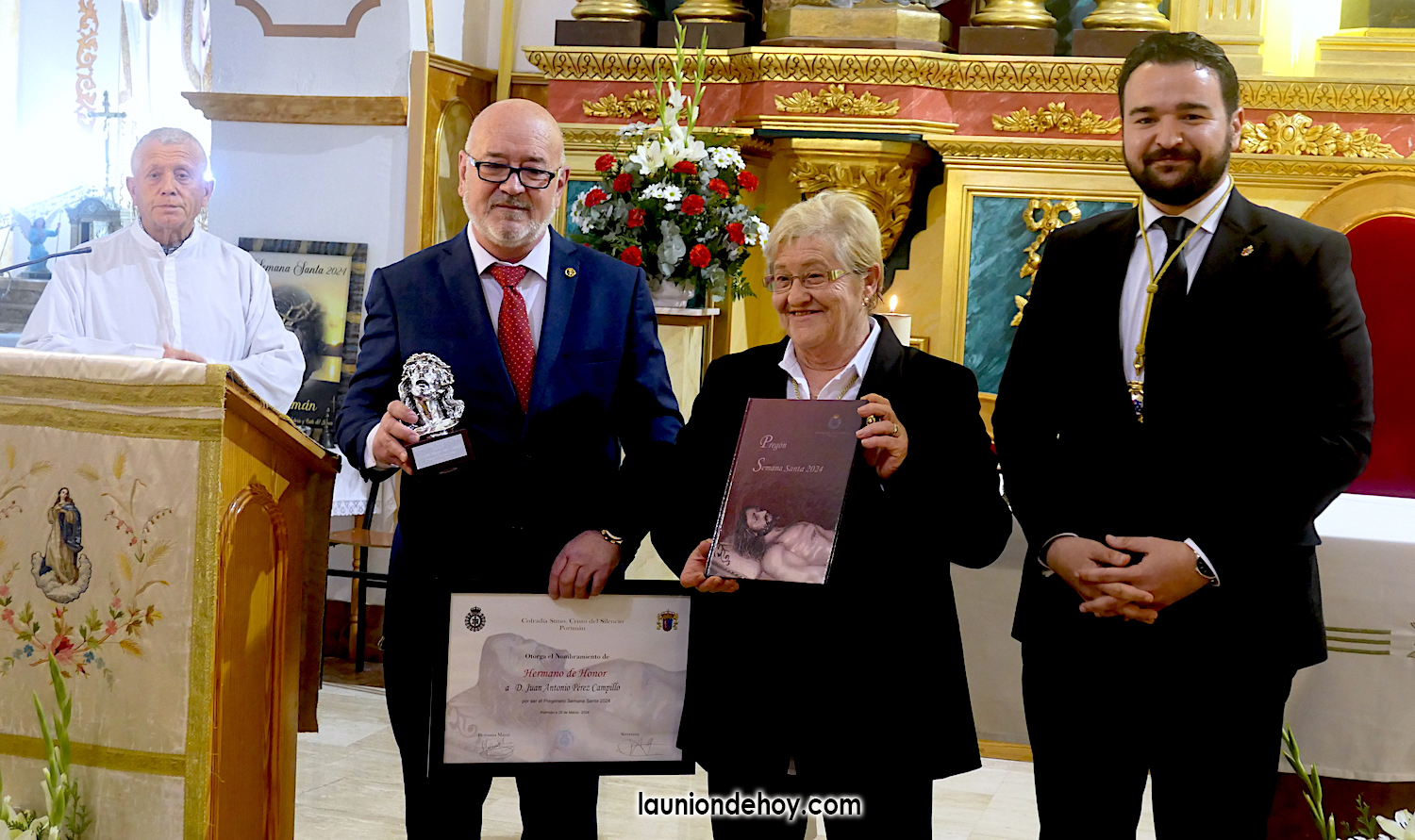 En el epílogo del acto y antes de comenzar la misa que ofició el párroco, Andrés Vera, la hermana mayor de la Cofradía del Cristo del Silencio de Portmán, Conchi Verdú, y el alcalde, Joaquín Zapata, entregaron un cuadro y un trofeo con el busto de Jesús al pregonero. Entre los asistentes también estuvieron integrantes del PP en el equipo de gobierno municipal y el secretario general del PSOE La Unión, Pedro López.