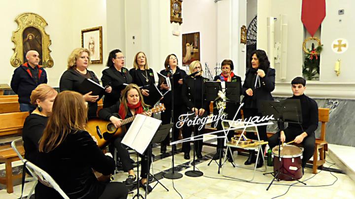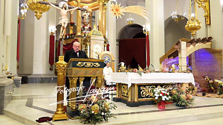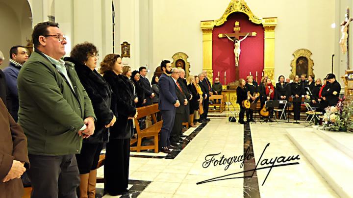 La misa fue oficiada por el párroco, Ginés Luis Vicente, quien, entre otros comentarios, en su homilia explicó las diferencias entre felicitar la Pascua, la Navidad o las fiestas. La celebración del oficio fue enriquecido por las voces del grupo coral 'Mujeres con alma' interpretando villancicos.