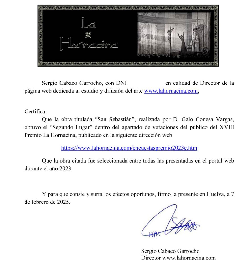 Sergio Cabacho Garrocho, como director de www.lahornacina.com, entregó el pasado siete de febrero al escultor unionense Galo Conesa el documento acreditativo de su participación, en el XIV certamen 'La Hornacina', en el que ha alcanzado el segundo lugar, en concurso con 60 artistas, con la obra que plasma el martirio de 'San Sebastián', realizada en madera policromada para la ciudad conquense de Horcajo de Santiago.