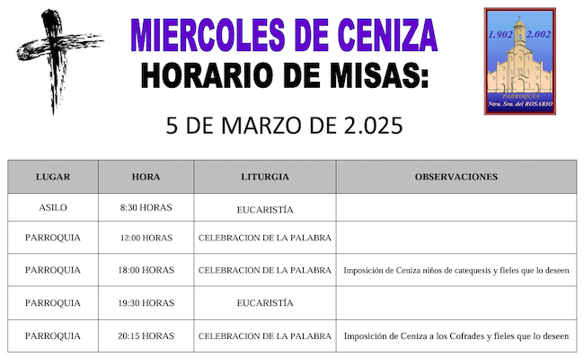 De igual manera, el acto de imposición de la ceniza para cofrades previsto para el Miércoles de Ceniza, queda también anulado, pasando libremente a deseo de cada cofrade, asistiendo según los horarios citados que a continuación informamos, en la imagen compartida por la parroquia de Ntra. Sra. del Rosario, donde se indica lugar y horario: