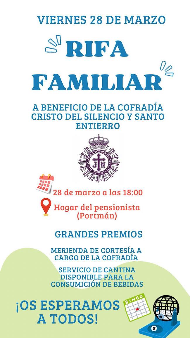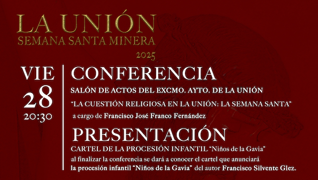 El salón de actos del Ayuntamiento de La Unión acoge esta noche la conferencia 'La cuestión religiosa en La Unión: la Semana Santa', a cargo de Francisco José Franco Fernández, del equipo de cronistas oficiales de Cartagena, y la presentación del cartel de la procesión 'Los niños de la gavia', en actos organizados por la Cofradía del Cristo de los Mineros. Antes, por la tarde, el hogar del pensionista de Portmán acogerá una rifa familiar a beneficio de la Cofradía del Silencio y del Santo Entierro.
