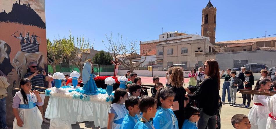 El alumnado que cursa la materia de religión católica en el colegio de la villa de El Garbanzal ha sido el gran protagonista de la procesión de Semana Santa Minera que se ha celebrado en sus instalaciones, lo que ya se ha convertido en tradición.