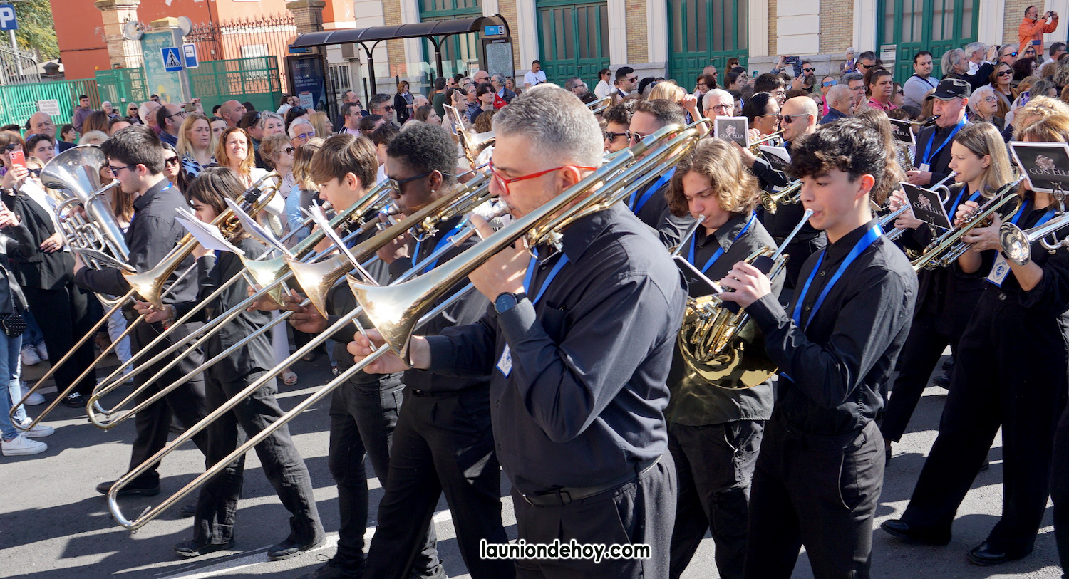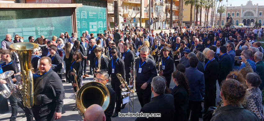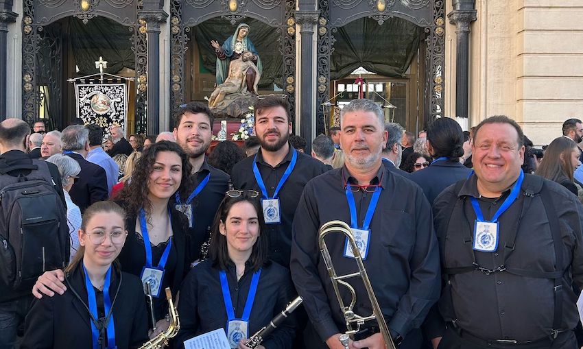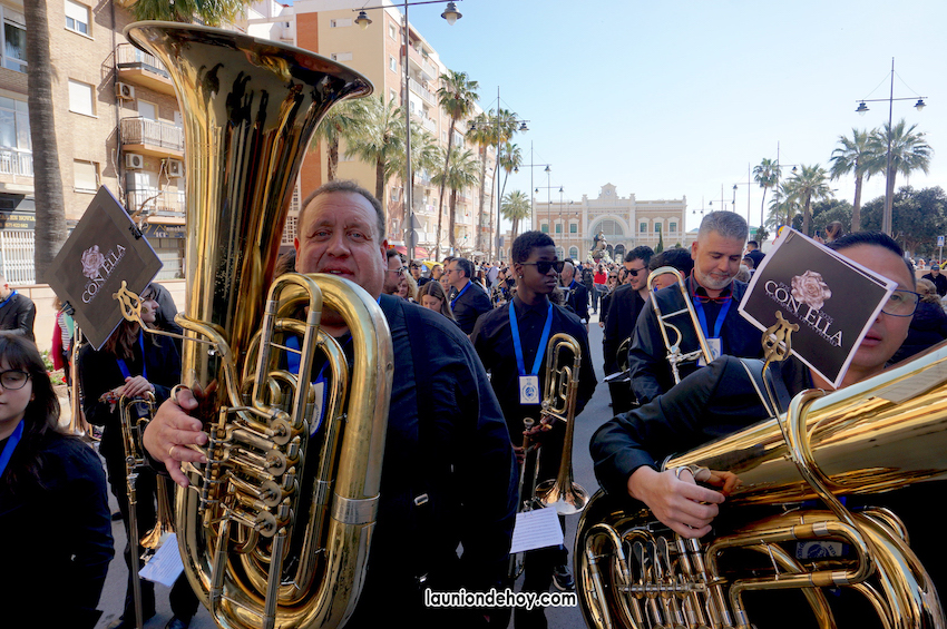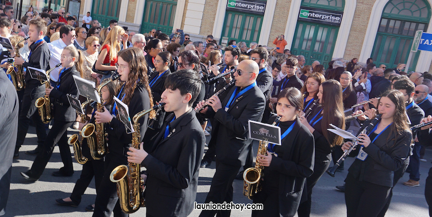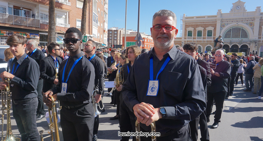 Integrantes de la Agrupación Musical La Unión se apuntaron a la banda de música formada por voluntarios de colectivos musicales de la comarca que acompañó a la Virgen de la Piedad de Cartagena en el recorrido entre la estación de tren y la iglesia de Santa María con motivo del centenario de la llegada de la imagen que esculpió José Capuz.