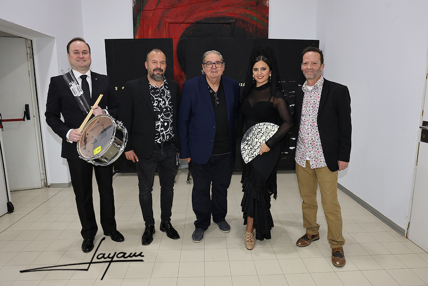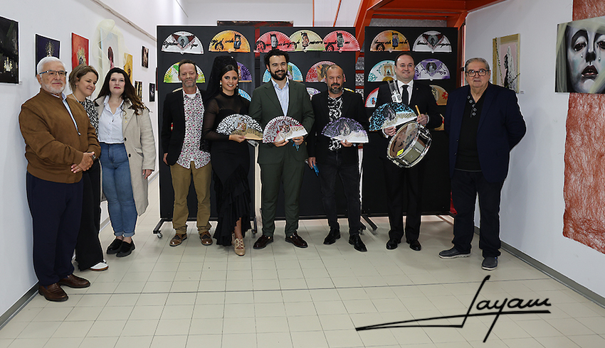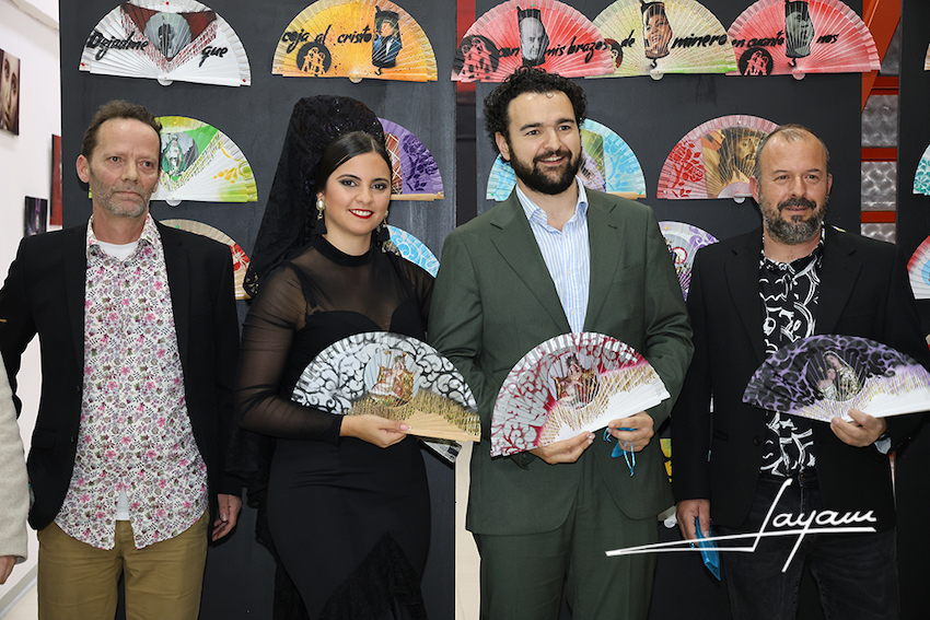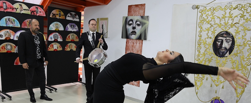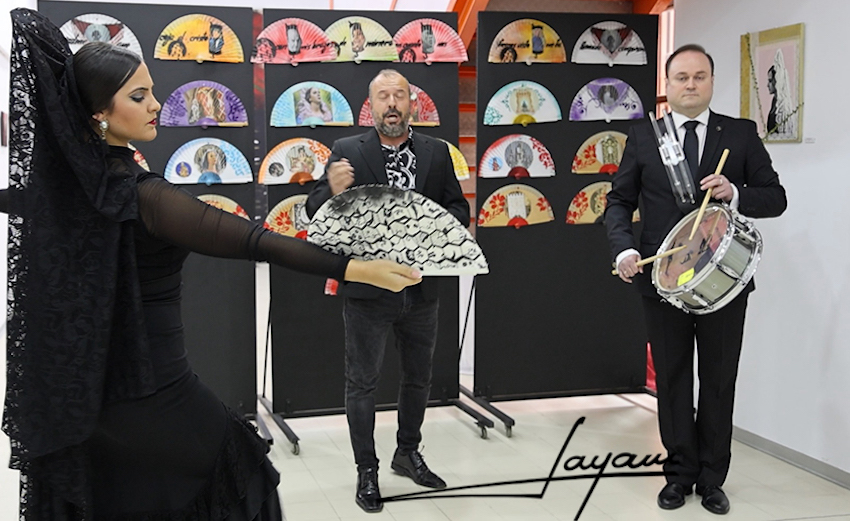 La exposición de abanicos artesanales pintados a mano por David López Rodríguze, con motivos de las imágenes de la Semana Santa Minera y que están expuestos en la sala del Ayuntamiento de La Unión,  se vestía de gala esta mañana para en honor a la Virgen del Rosario en sus Misterios Dolorosos, a la que se ha dedicado una saeta cantada por el cantaor unionense Sebas Andreu, acompañado al tambor por Jose Antonio Martínez, con María Elena Lorente, alma mater de Artedanza, enriqueciendo el momento con su baile.