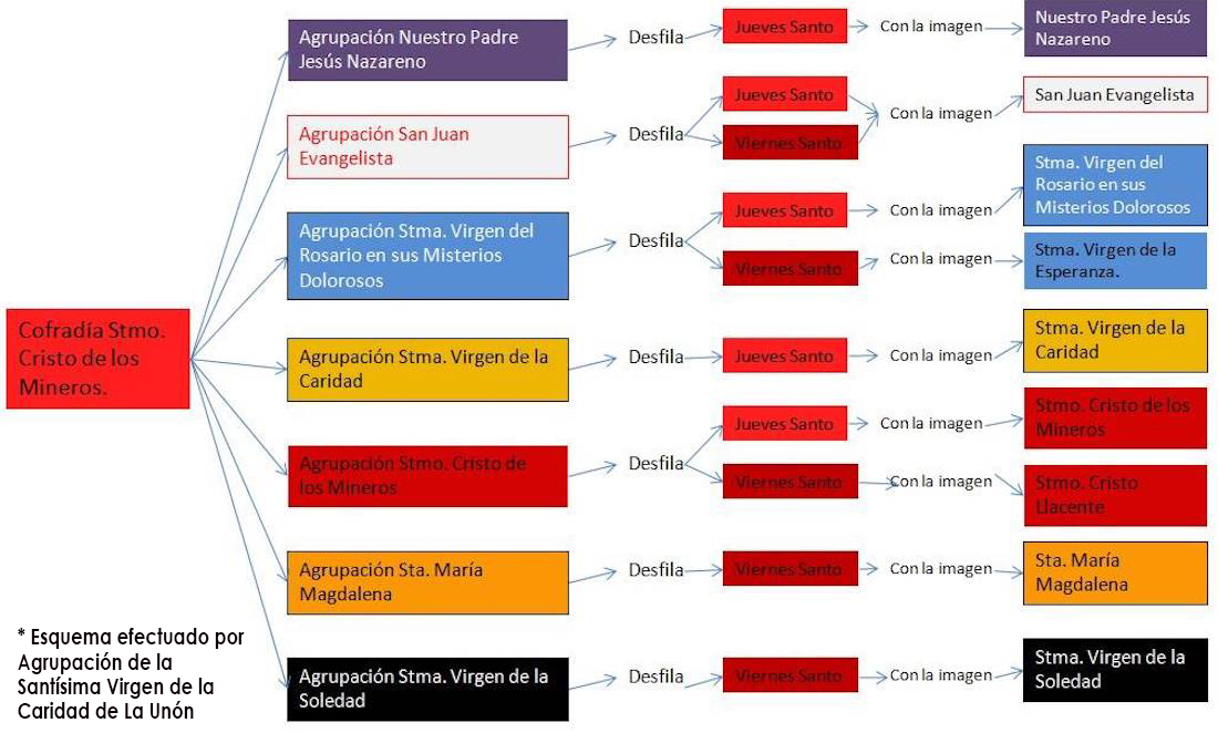 Son tres las procesiones que pone en la calle la Real e Ilustre Cofradía del Cristo de los Mineros a través de sus siete agrupaciones, siendo las más reciente la del Sábado de Pasión centrada en la cantera procesionista, de la que forma parte todas las agrupaciones.