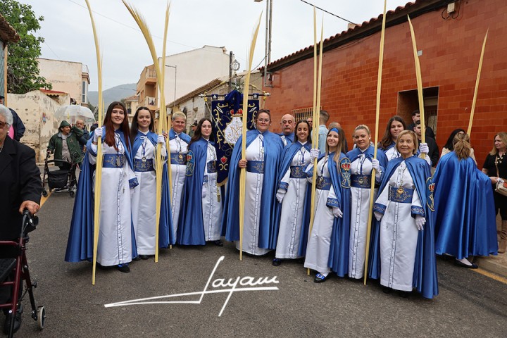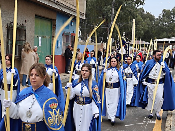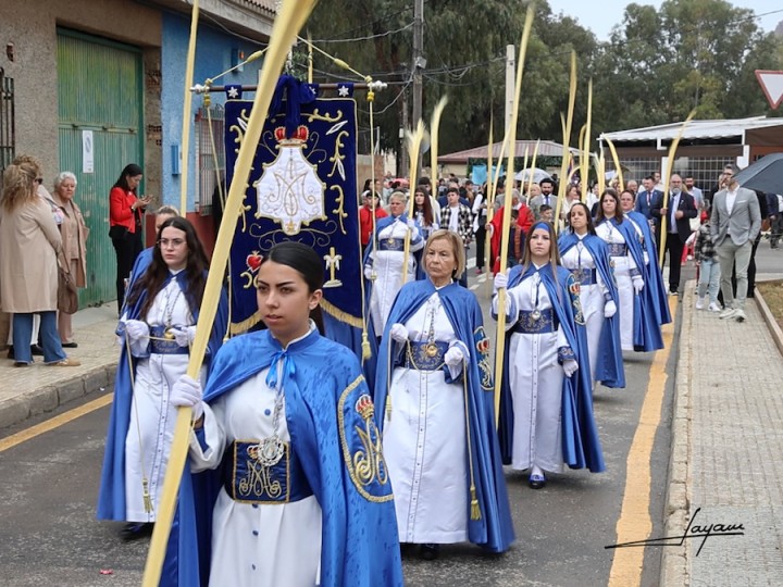 Una llovizna acompañó (y recortó) el recorrido de la procesión del Domingo de Ramos de Portmán, que este año tuvo como agrupación invitada a Nuestra Señora del Rosario en sus Misterios Dolorosos de La Unión, desfilando los nazarenos de las dos localidades juntos con las galas de la Dolorosa.